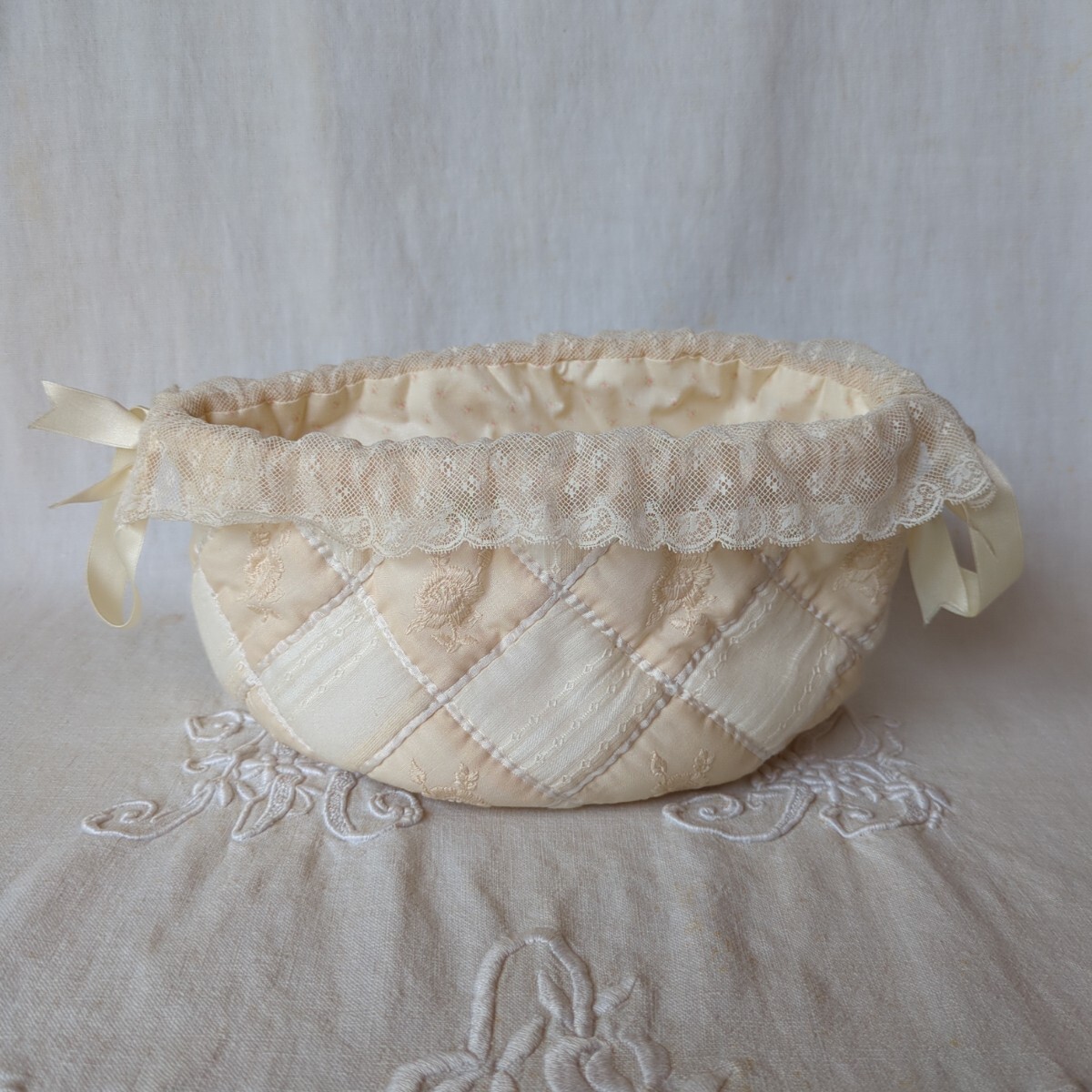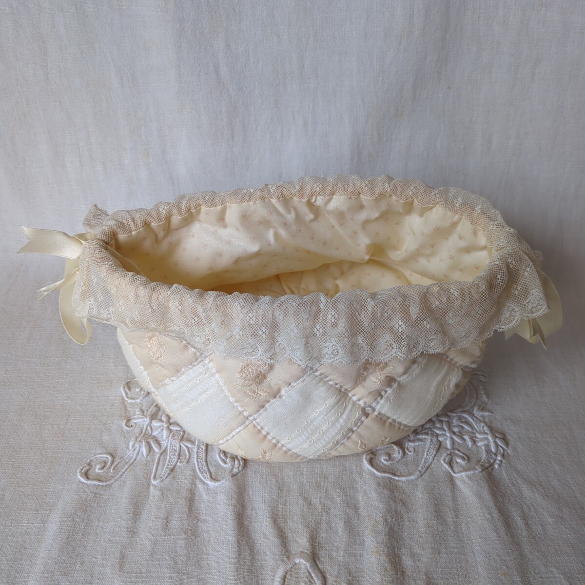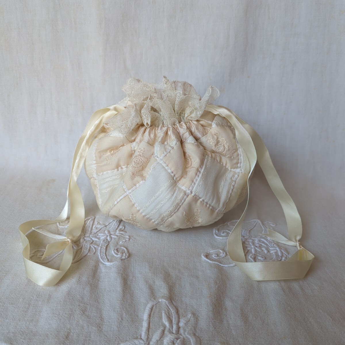 オフホワイトとクリーム色のわずかに色味の異なる2種類の刺しゅうコットン生地をつなぎ合わせて、その合わせ目の上にシルクの幅3ミリの細いリボンが縫い付けられています。クリーム色の方はバラ柄の刺しゅうがあしらわれています。口部分の持ち手のリボンを通している生地はオフホワイトのシルクです。口部分には繊細なアンティークレースが縫い付けられています。