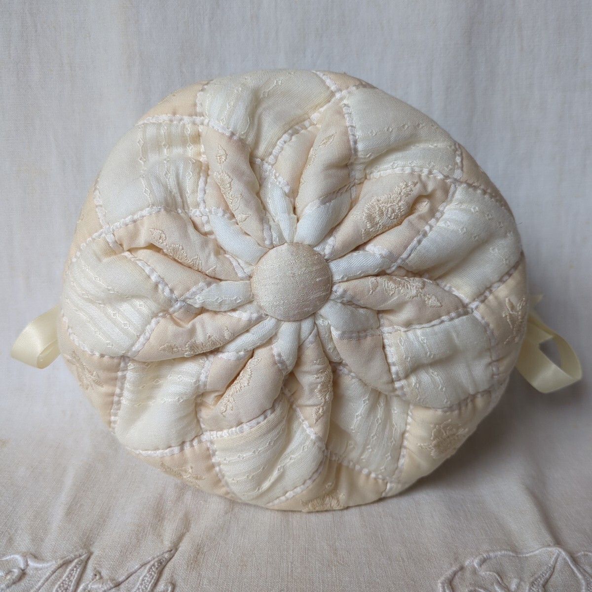 キルト生地やリボン、アンティークレースの色合いが上品で、コロンとしたフォルムが可愛い素敵なパッチワークバッグです。