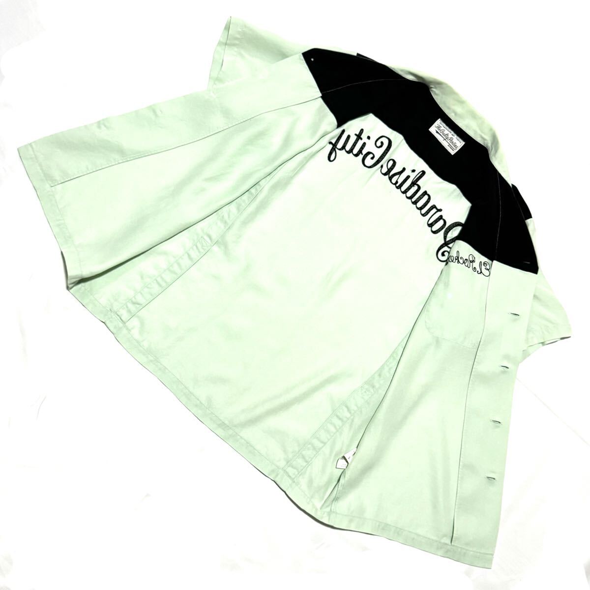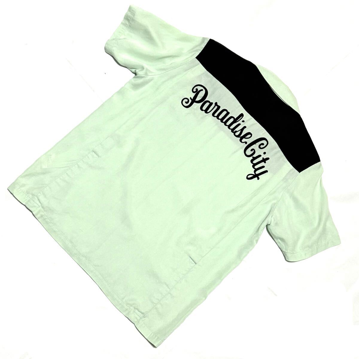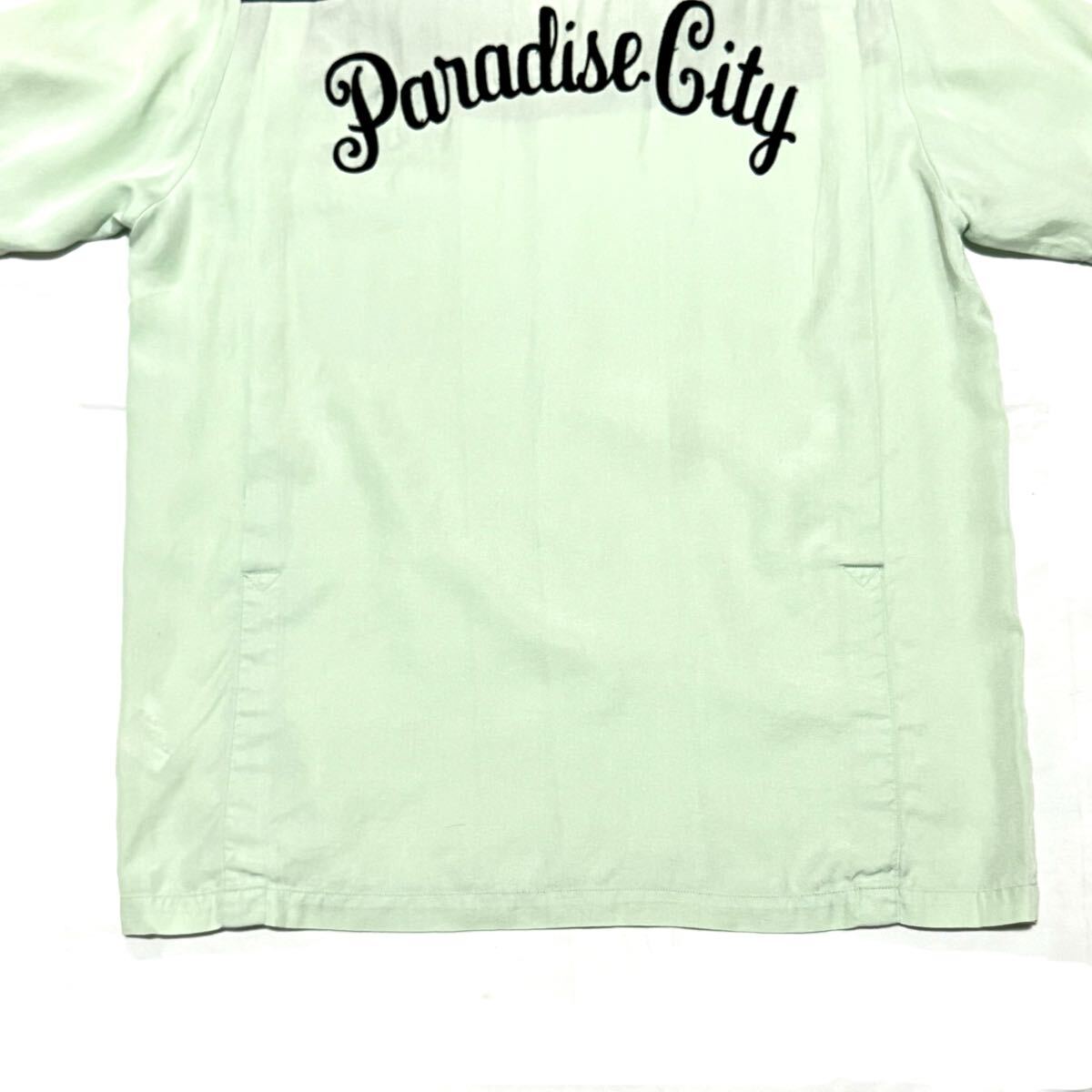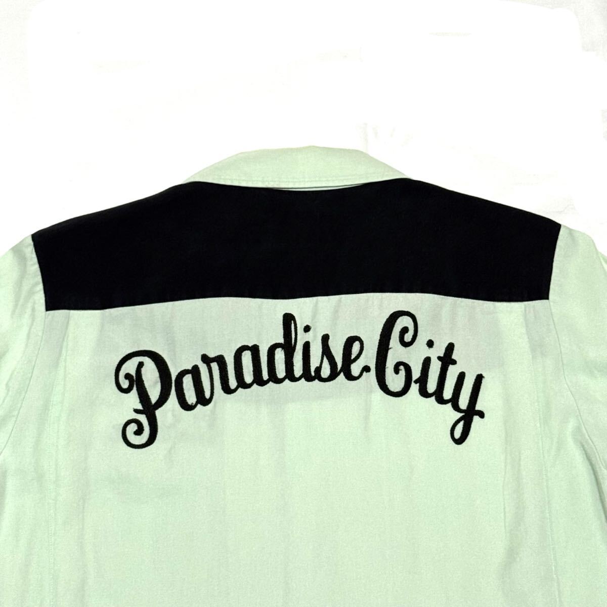 WACKO MARIAの日本製開襟シャツ「The Guilty Parties」、背面に大胆な“Paradise City”、胸元に“El Rocker”の刺繍入り。ミントグリーン×ブラックの切替デザインがクールで目を惹く半袖ボウリングシャツです。