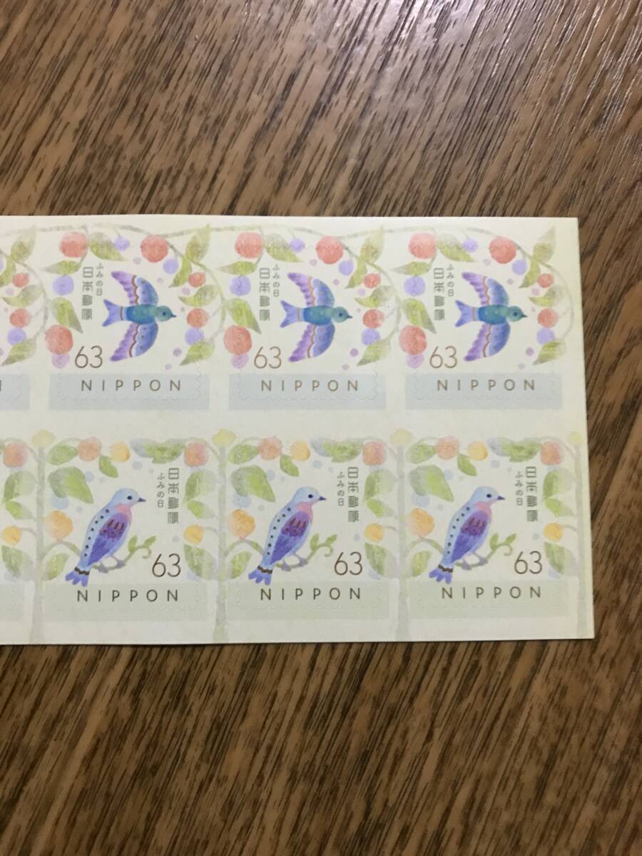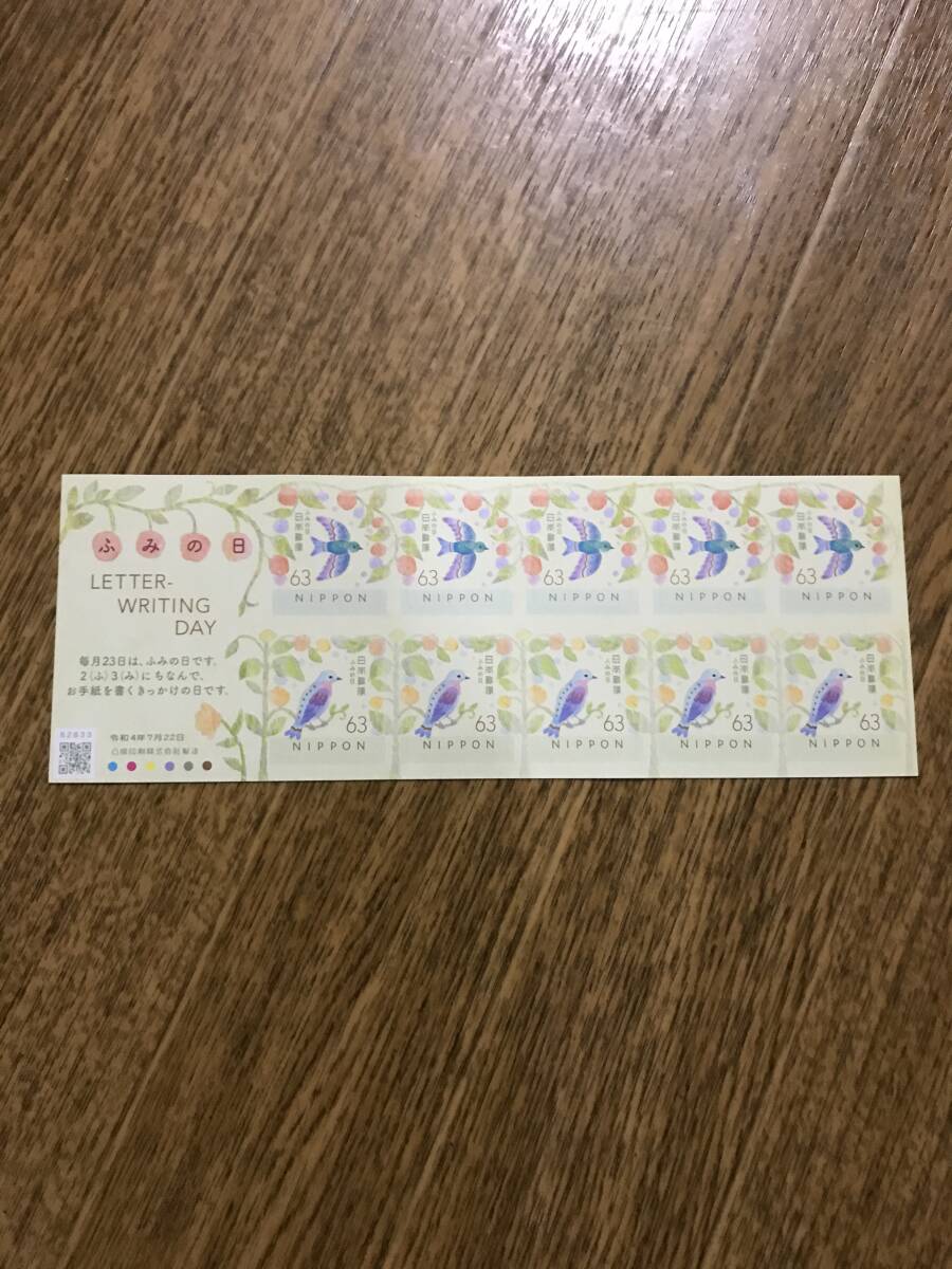 ★「ふみの日(令和4年版)」:シール切手シート(63円×10枚=630円分)です。