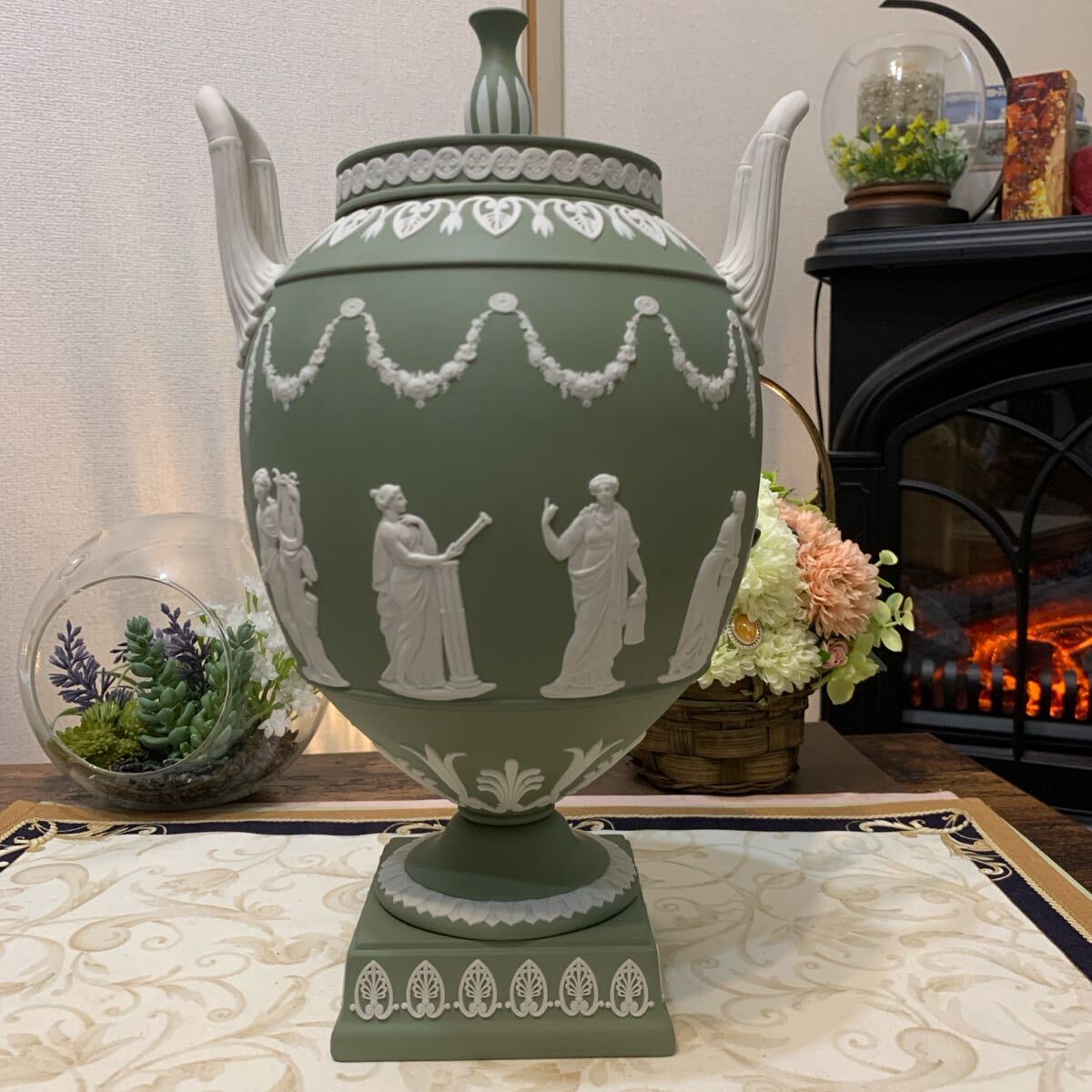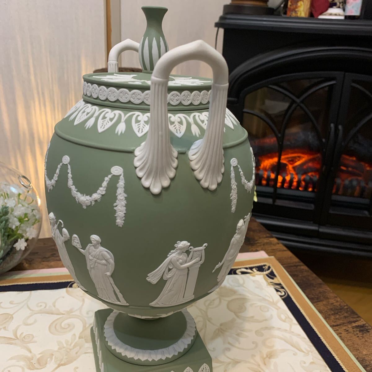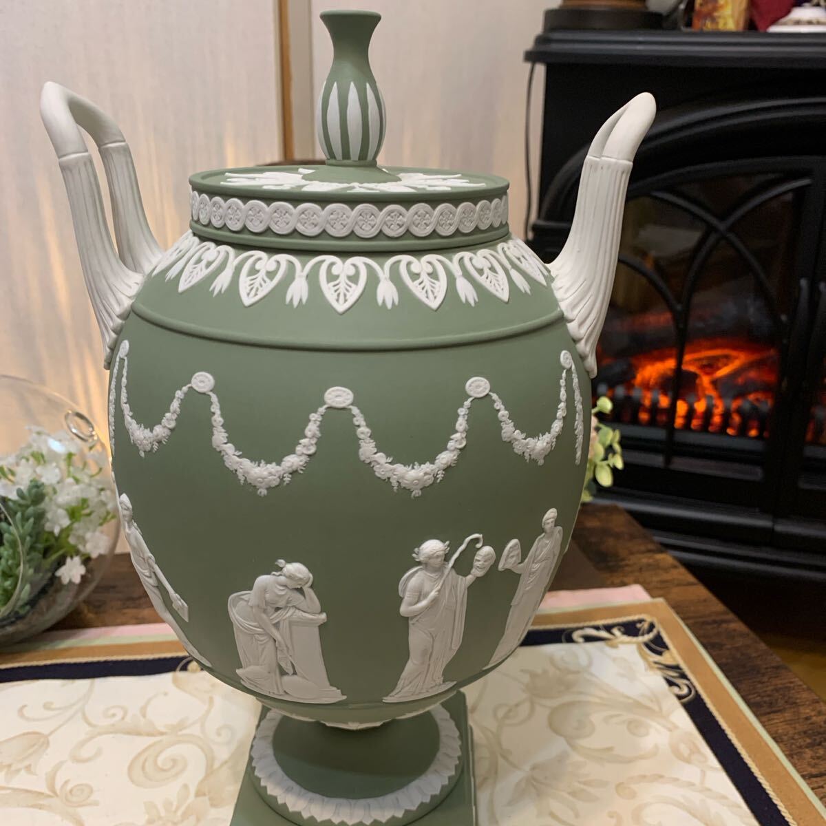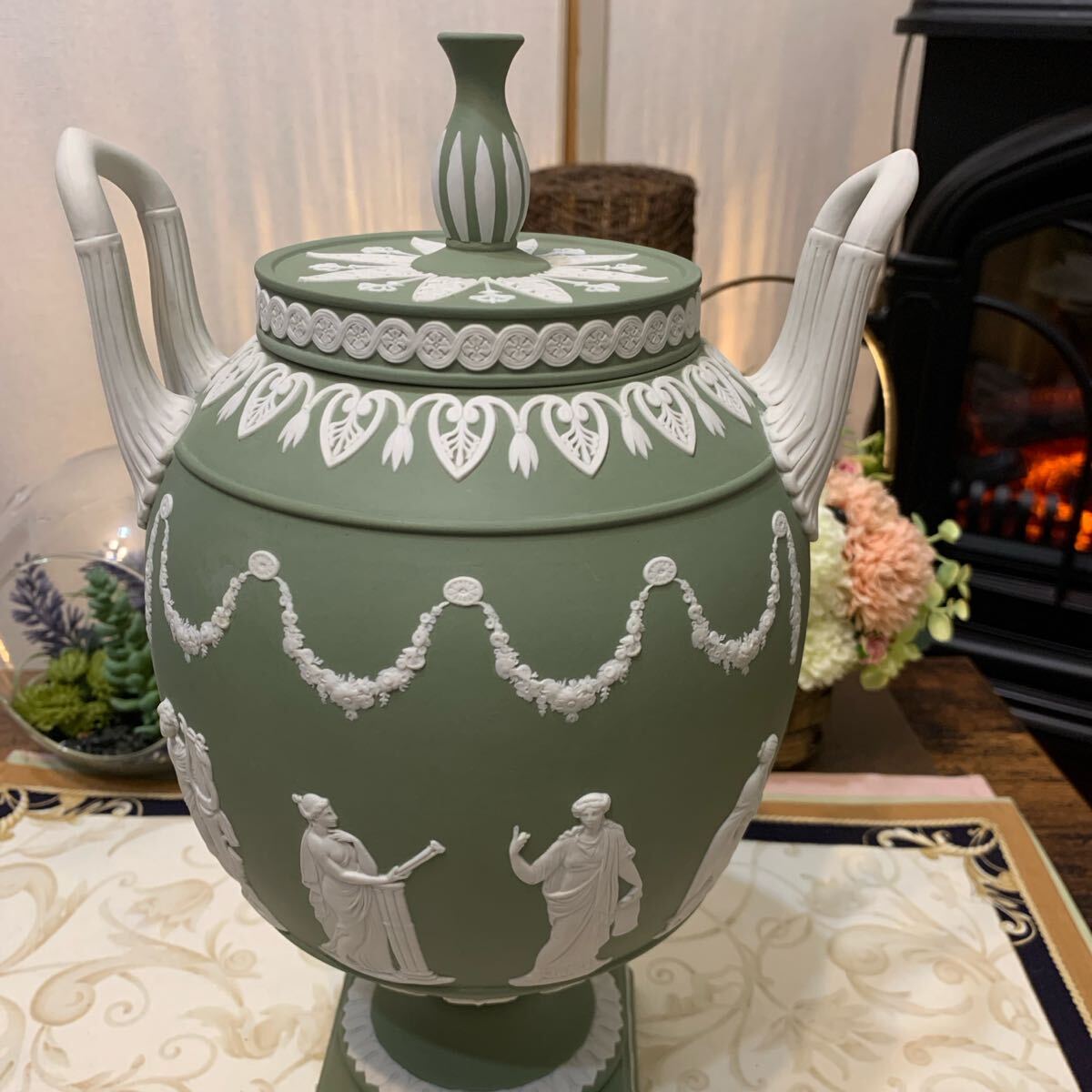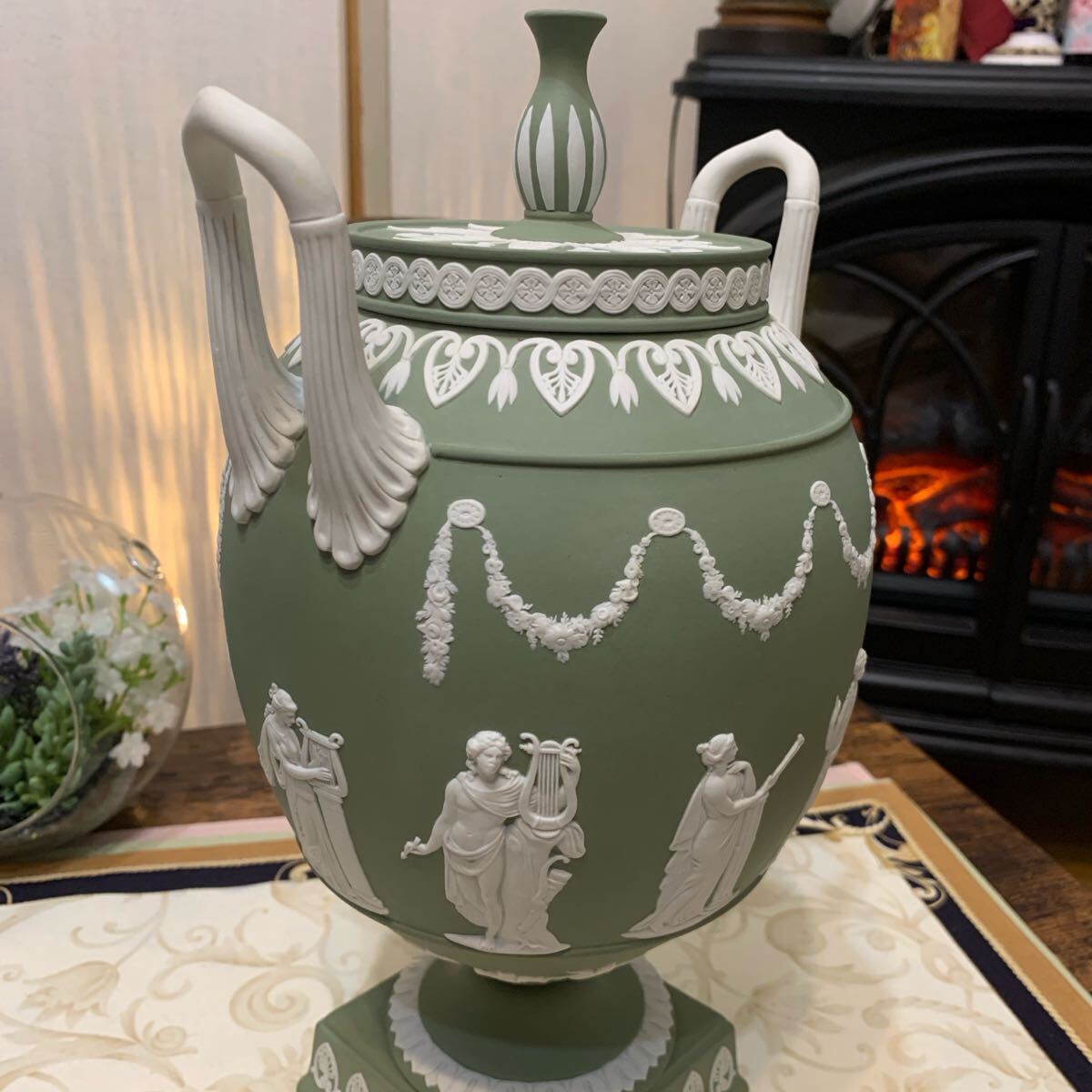 希少なジャスパー セージグリーン の飾り壺、フラワーベース、花瓶です。