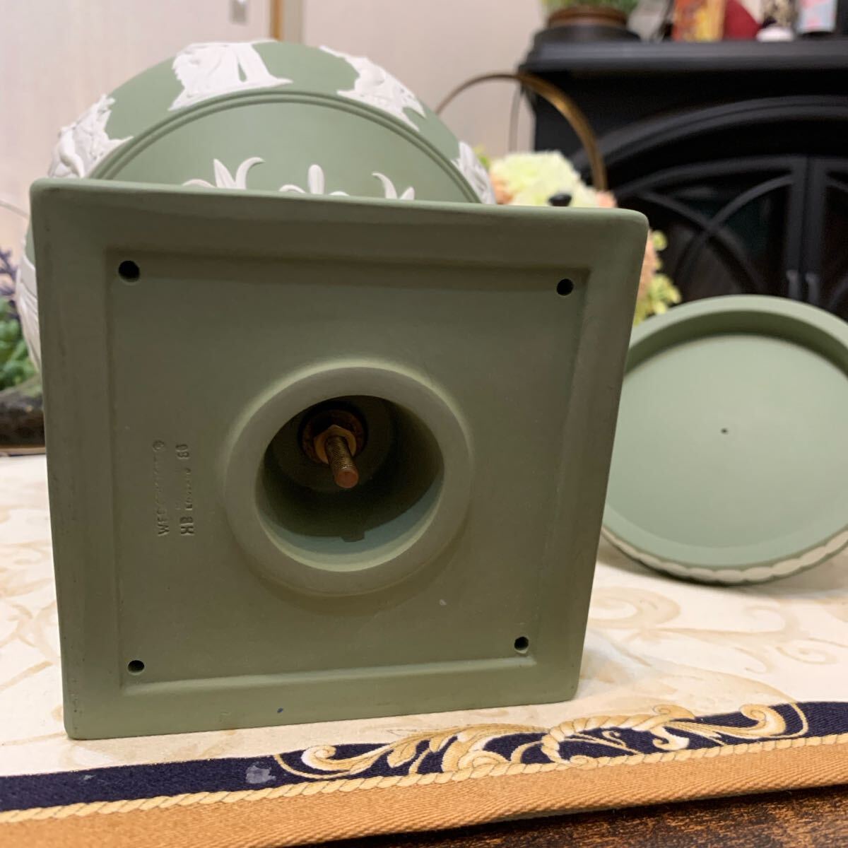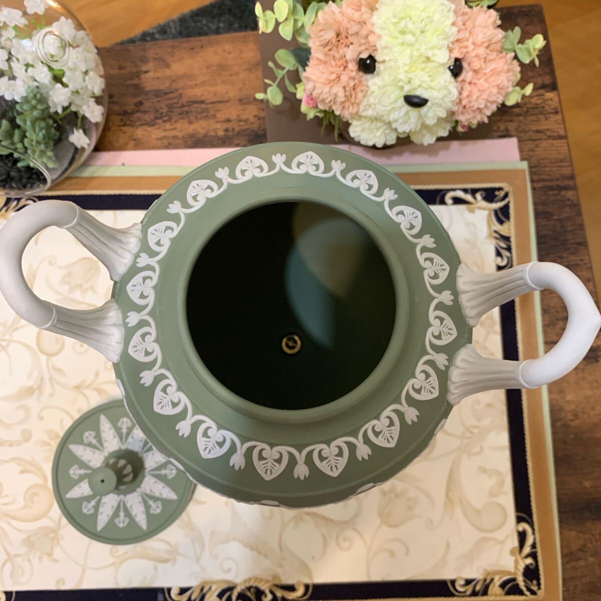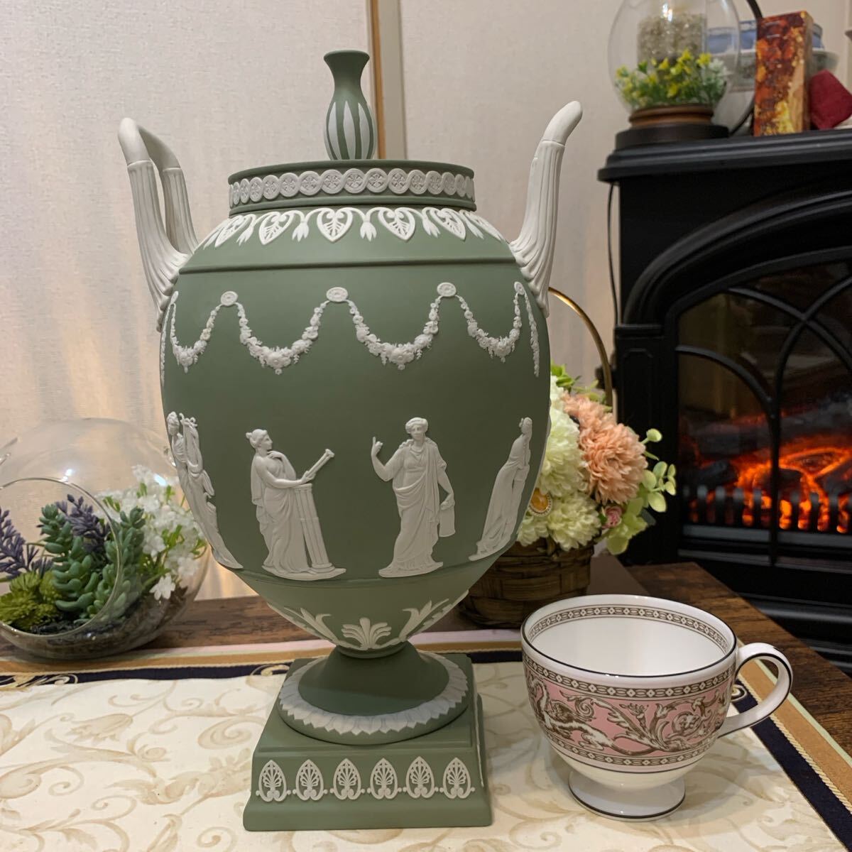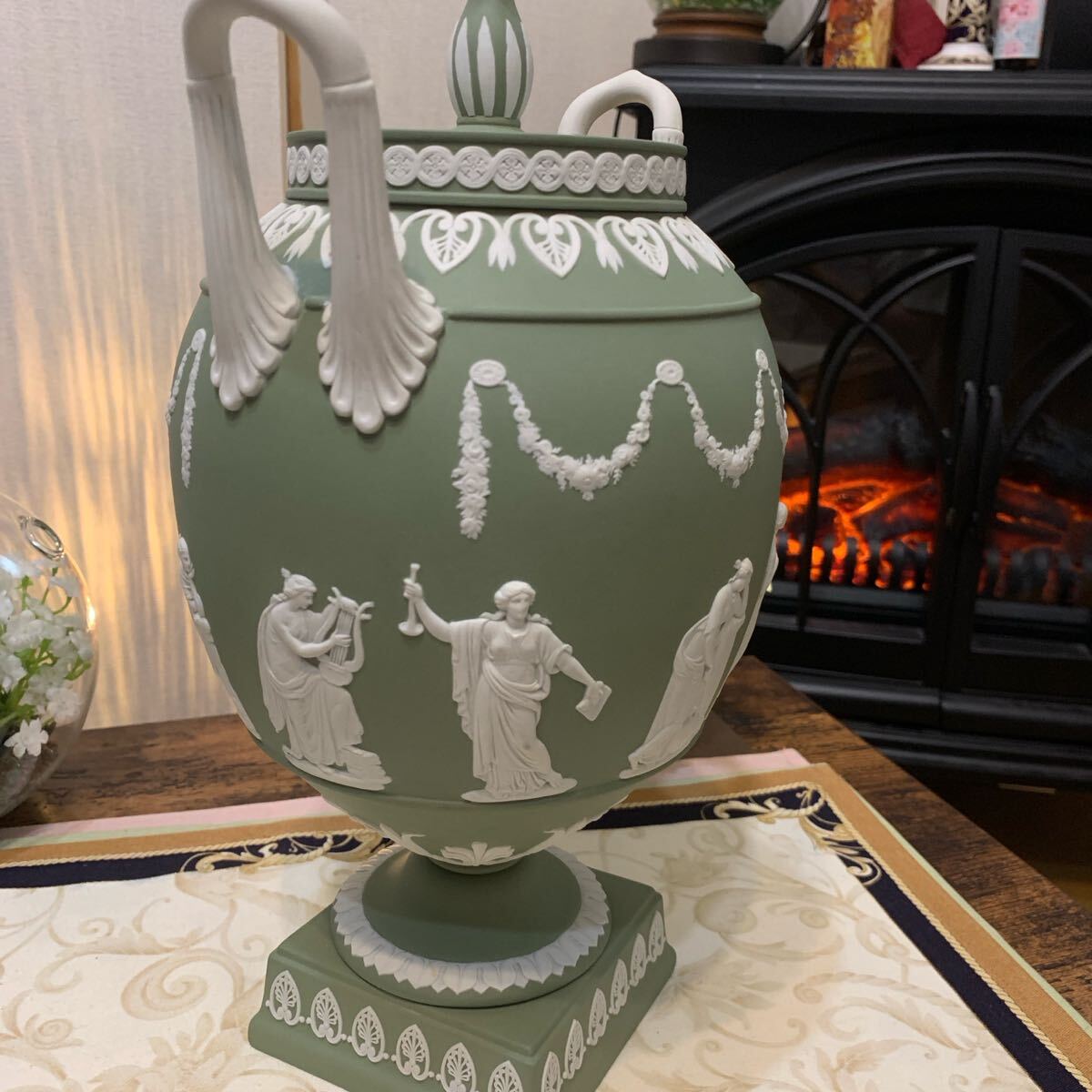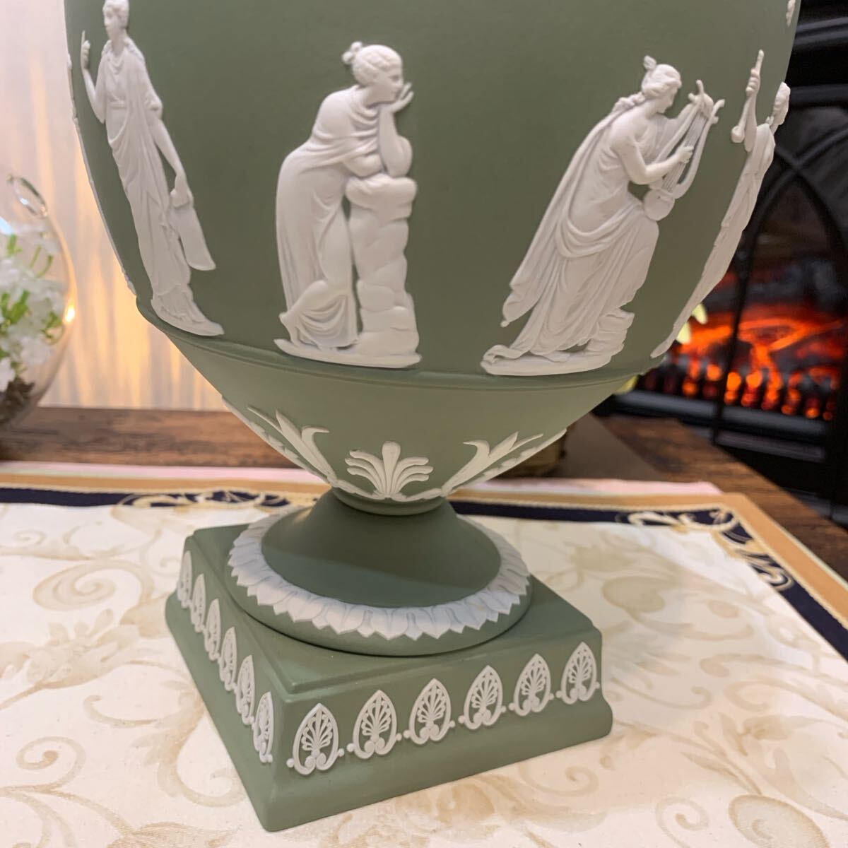 希少なジャスパー セージグリーン の飾り壺、フラワーベース、花瓶です。