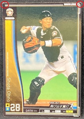 オークションサイトで購入した時点で、カード面に傷(画像の赤丸印)がございました。光の加減でわかりにくいかもしれませんが、特に、表面の左上の角の傷は目立ちます。 それ以外は、比較的綺麗なほうだと思います(あくまで主観です)。 自宅保存しておりましたので、その辺をご考慮していただきたく思います。 |