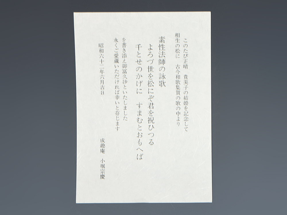 遠州流 12世 成趣庵 小堀宗慶 御冨久紗 松 ふくさです。 古今和歌集 賀歌 「万代を 松にぞ君を 祝ひつる 千歳のかげに 住まむと思へば」の一説が書き添えられた ふくさです。 小堀宗慶 花押あり。 未使用品として保管管理されており美品です。 ※撮影の際に生じた写り込みなどがございます。 ご理解の程よろしくお願い致します。 |