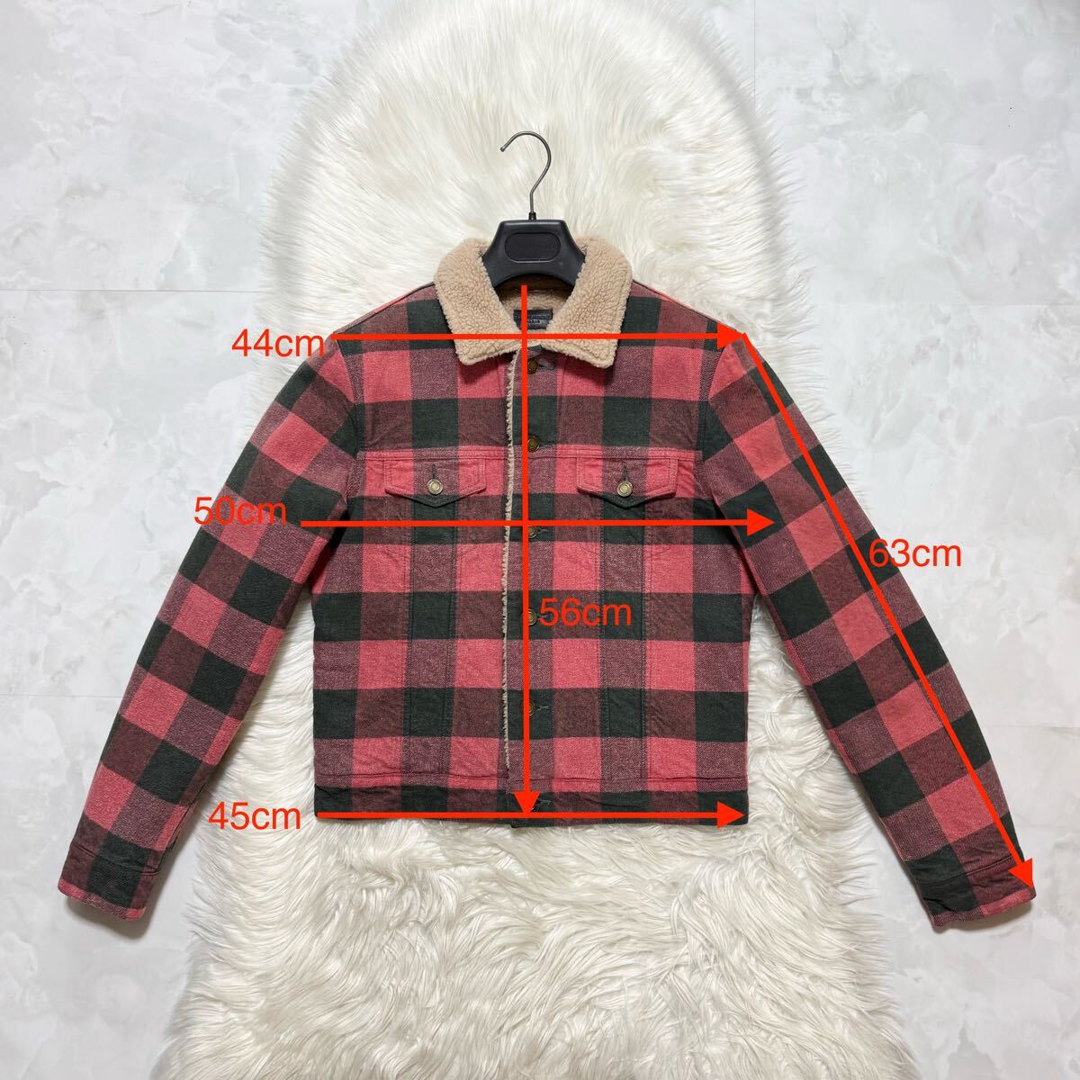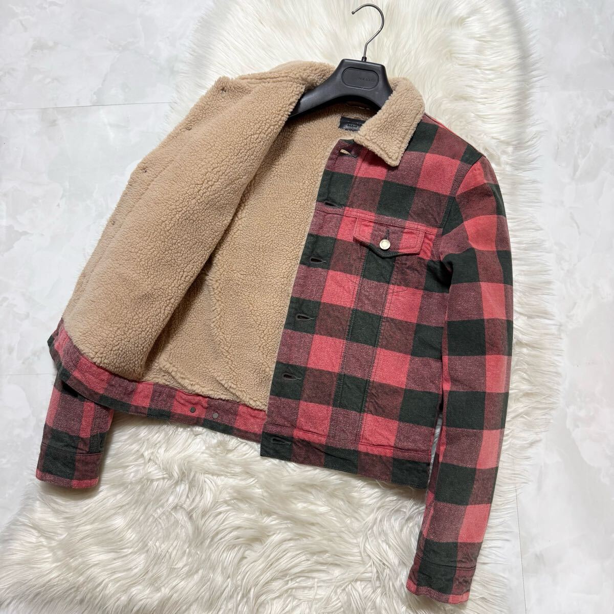 ○本物 極美品 サンローランパリ シワ加工 裏地ボアファー チェック柄 ブルゾン ジャケット S 赤 黒 Saint Laurent Paris ○色 : 淡いレッド・ブラック系 ○サイズ : S ○素材 : コットン100% / 牛革 / ポリエステル100% ○状態 : 微細な毛羽が見られますが、全体的に着用感のあまり感じられない未使用に近いお品です。 淡いトーンのレッドとブラックで構成されたチェック柄が特徴的な一着。シワ加工が施された生地感により、程よくラフで清潔感のある印象を与えます。裏地には上質なボアファーが施されており、見た目のエレガンスさに加え、防寒性にも優れた仕上がりとなっています。トレンディなシルエットが魅力的な、サンローランらしい高級感のあるブルゾンです。 SAJR59523100