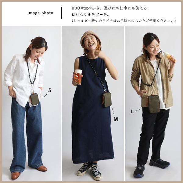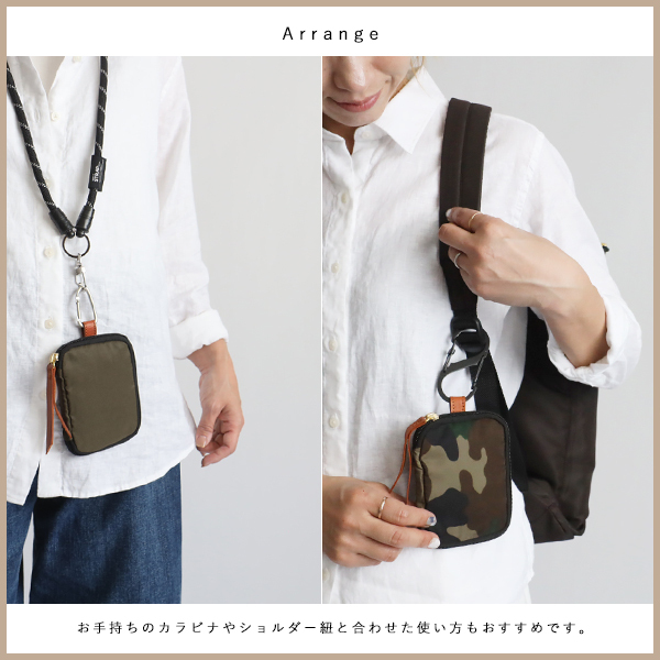 鞄に付けたり、斜め掛ショルダーポーチとして持ち歩くこともできます。