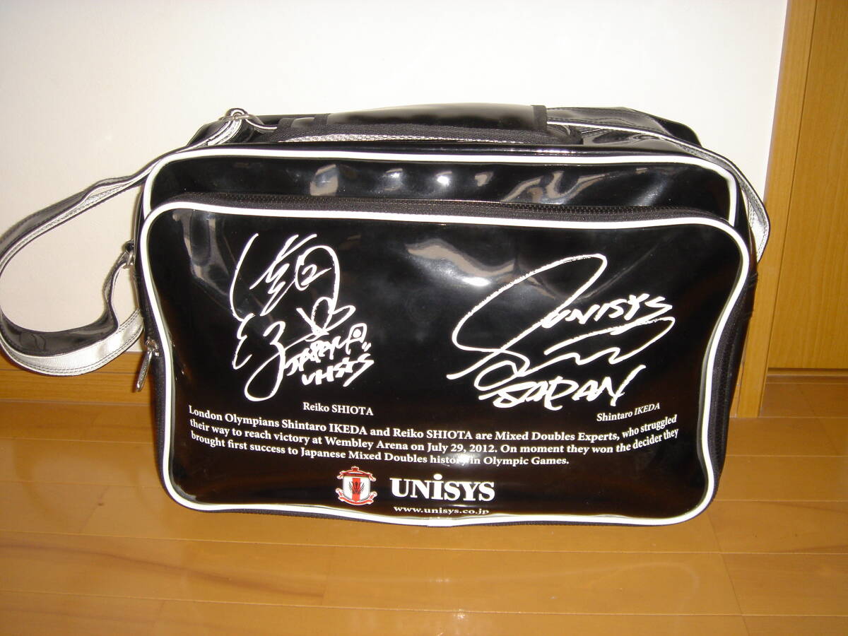 イケシオ(潮田玲子と池田信太郎)の プリントサイン入りエナメルバッグの出品です。