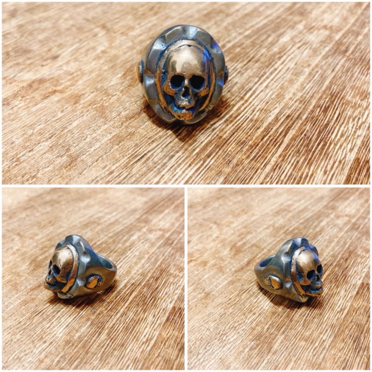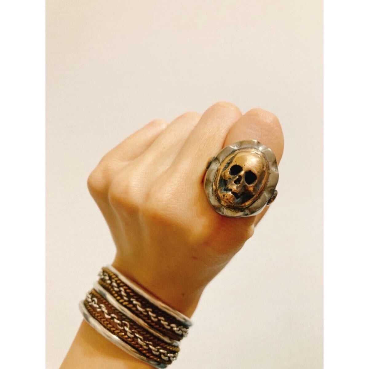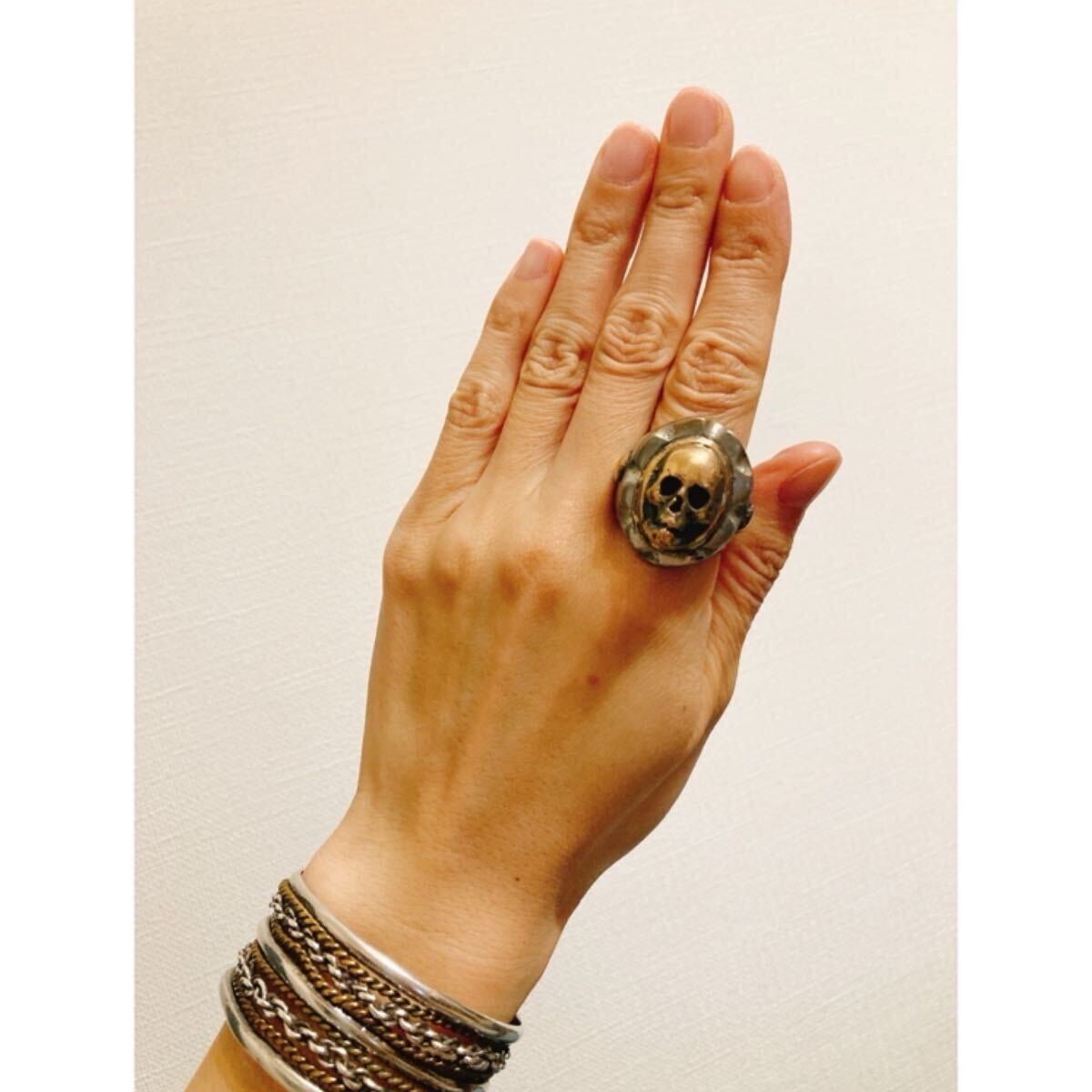 ブランド: ビンテージメキシカンバイカーリングサークルスカルヘッド。ニューメキシコ在住、長年買付でお世話になっている、ビンテージコレクターから譲り受けた逸品。メキシカンバイカーリングの芸術的名作。美し過ぎるの一言!ビンテージの雰囲気全開です!お探しの方、お好きな方はこの機会に是非!!安価にてお譲り致します。日本で大手オンラインインディアンアメリカジュエリーストアや東京で扱ってるお店で同じ様な ビンテージメキシカンバイカーリングを購入したら、この値段の2倍近くしますよ。まずこの値段では買えません!このデザインはなかなかに手に入りませんよ!