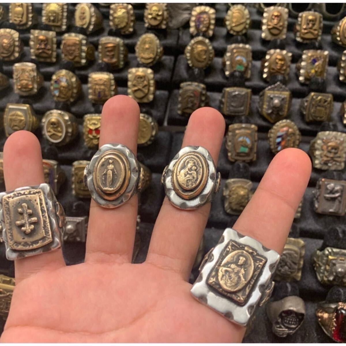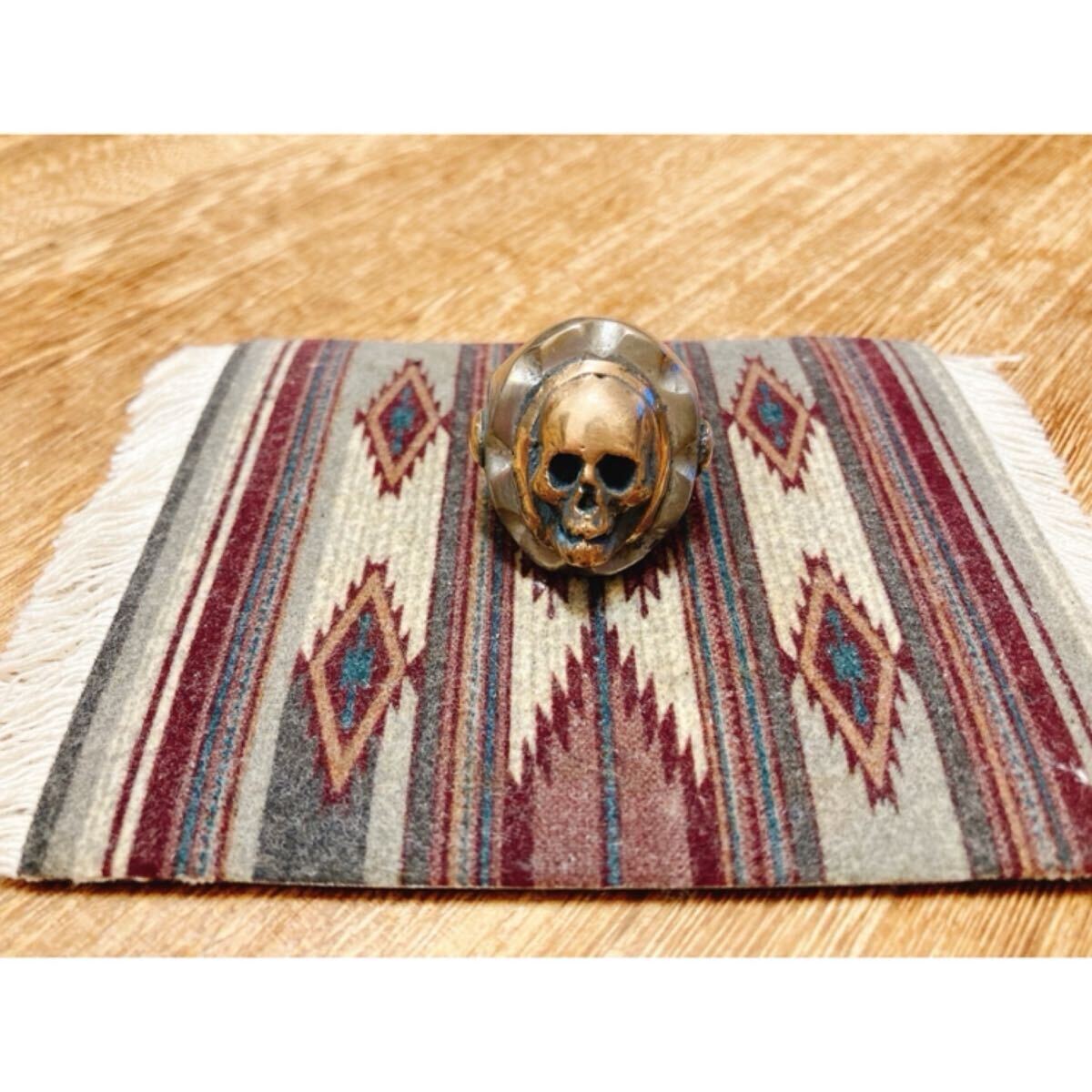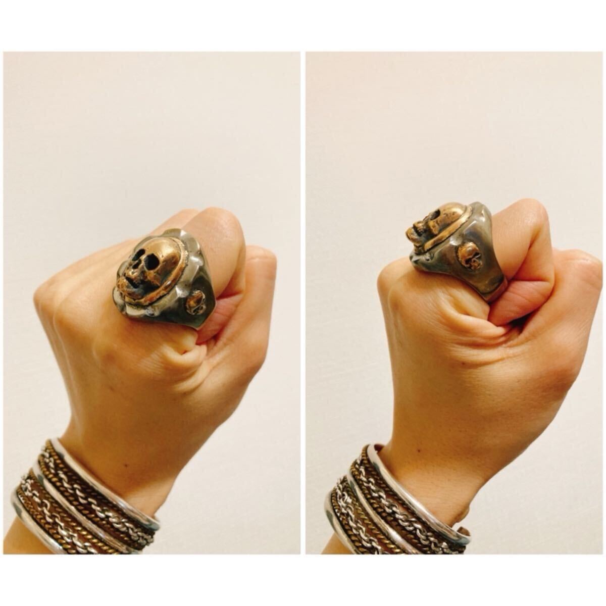 ブランド: ビンテージメキシカンバイカーリングサークルスカルヘッド。ニューメキシコ在住、長年買付でお世話になっている、ビンテージコレクターから譲り受けた逸品。メキシカンバイカーリングの芸術的名作。美し過ぎるの一言!ビンテージの雰囲気全開です!お探しの方、お好きな方はこの機会に是非!!安価にてお譲り致します。日本で大手オンラインインディアンアメリカジュエリーストアや東京で扱ってるお店で同じ様な ビンテージメキシカンバイカーリングを購入したら、この値段の2倍近くしますよ。まずこの値段では買えません!このデザインはなかなかに手に入りませんよ!