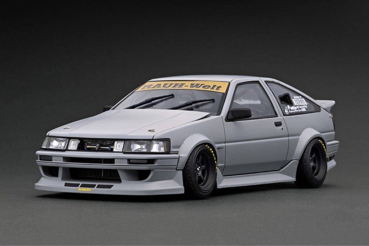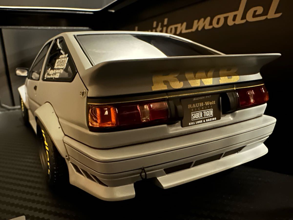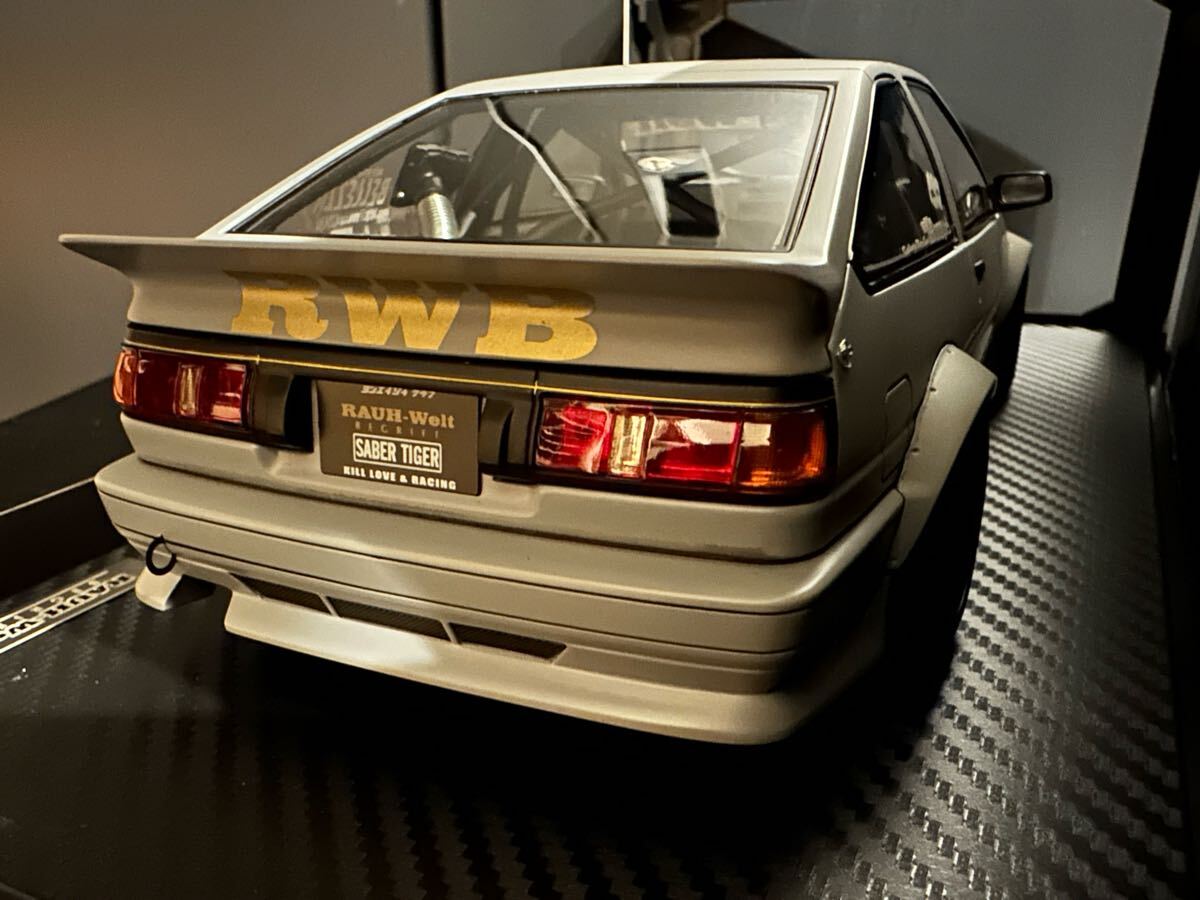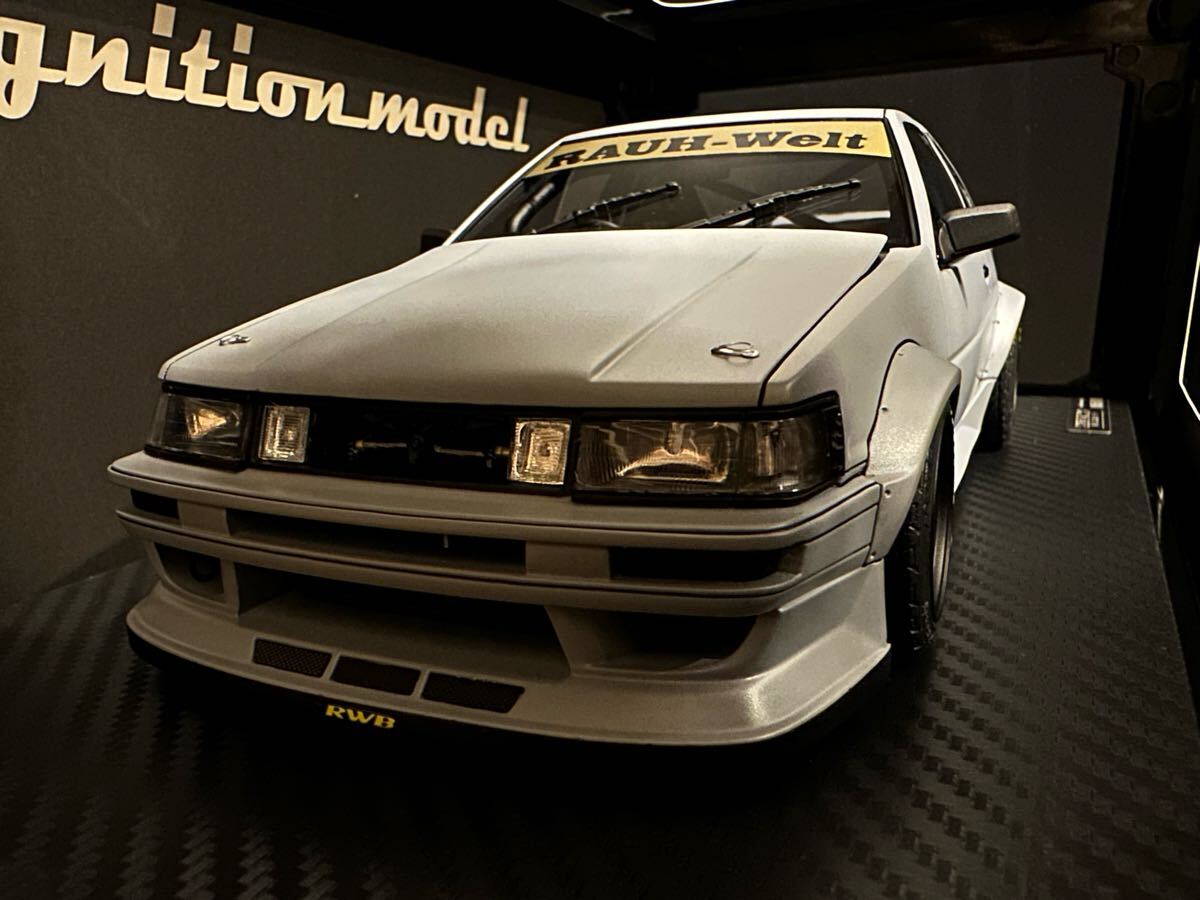 RWB AE86を1/18スケールレジンモデルで再現。15インチスポークホイールにローダウン仕様。