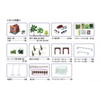 セット内容 | ・ディスプレイカバー×1個 ・商店C(茶)×1個 ・小屋×1個 ・パウダー類×各1袋 ・乗用車×2個 ・牛×2個 ・樹木(濃緑)×8本 ・樹木(緑)×12本 ・樹木(黄緑)×6本 ・フォーリッジ類(濃緑、緑)×各1袋 ・バラスト(灰色)×1袋 ・トンネルポータル(A、B)×各1個 ・ガードレール(長)×4個 ・ガードレール(短)×4個 ・街路灯×8個 ・柵(茶)×2個 ・踏切(日本型)×4個 ・取扱説明書×1 ※車両(列車)は別売り |