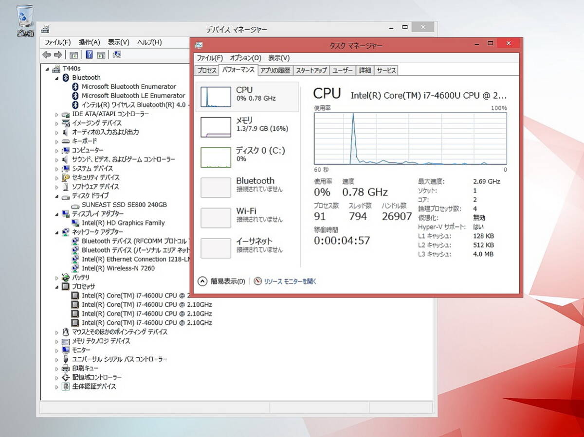 | 商品説明 | 14型液晶を搭載したスリムノートPC「ThinkPad T440s」 ポインティングデバイスはトラックポイント用ボタンをクリックパッドに 統合した「5ボタンクリックパッド」を採用。 主な仕様は、CPUが第4世代 Core i7、メモリーが8GB DDR3、 ストレージが240GB SSD、無線LAN Bluetooth 内蔵モデルです。 Windows8.1 Pro 64ビットをリカバリ済ですので、すぐにお使いいただけます。 【仕様】 OS Windows8.1 Pro(64bit)正規版 プロセッサー インテル Core i7-4600U 2.10GHz/2コア4スレッド 最大3.30GHz メインメモリー 8GB(オンボード4GB+増設4GB、空きスロット無し) CD/DVDドライブ 無し 液晶表示装置 14型ワイドノングレアIPS液晶(1920x1080ドット) ストレージ SSD 240GB(S-ATA) サイズ:331(幅)×226(奥行き)×20.65(厚さ) 重量:約1.59 kg ■状態 Windows8.1 Pro 正規版を再インストールしています。(ライセンス認証済) デジタルライセンス認証ですので、OSのシールのみ貼付されています。 デバイスマネージャーには不明なデバイスは無く、正常に稼動しております。 BIOS起動・変更できました。 キーボードの入力できました。 再セットアップ時に使用したキーには反応しないキーはありませんでしたが、 全てのキーは確認していません。 タッチパッドとトラックポイントのカーソル操作できました。 クリックボタンも使用できました。 無線LANにてアクセスポイントの受信できました。 ※サポート終了OSのため、インターネット接続は未確認です。 バッテリー充電、起動も可能ですが、使用可能時間は未計測です。 内蔵サブバッテリーは装着されていません。 【バッテリ】 動作確認時点でのバッテリー情報(参考): ・予想稼動時間:3時間59分(残量96%時) ※上記バッテリー情報は、使用時間・バッテリー性能を保証するものではございません。 目視で確認したところでは、液晶にライン抜けなどの症状は無いようです。 画面等に使用上、支障の無い程度の傷がある場合がございます。 中古品のため、天板・底面・キーボードやパームレスト等に傷や汚れなどがあります。 ※プリインストールソフトのユーザー登録は未確認ですので、不問にてお願いします。 ※Officeソフトはインストールされていません。 ※現状では動作に問題ないようですが、古い製品ですので、商品到着時点で 起動しない等の初期不良を除き、ノークレーム・ノーリターンと致します。 使用開始後に発生した動作不良には対応できませんので、御了承下さい。 ※即決落札の場合でも、発送は通常終了の翌日木曜日以降になります。 ※発送までの取り置きは可能ですが、早期発送はできませんので、御注意下さい。 ■この商品に対する注意事項 液晶のドット抜け及び液晶の色むらは、液晶の構造上起こる場合がございます。 初期不良対象外になり、交換致しかねますので、予めご了承ください。 ■付属品 ACアダプター ■発送方法■ 佐川急便で発送予定です。 ■お支払い方法■ ヤフーかんたん決済 出来るだけ良い物を、出来るだけ良心的な価格で 提供出来ますよう、これからも努力して参ります。 アイテムはドシドシ更新して参りますので、気に入って頂けましたら、 当方のIDをオークションアラートに追加して頂けますと幸いでございます。 最後まで御覧頂きましてありがとうございました。 | |