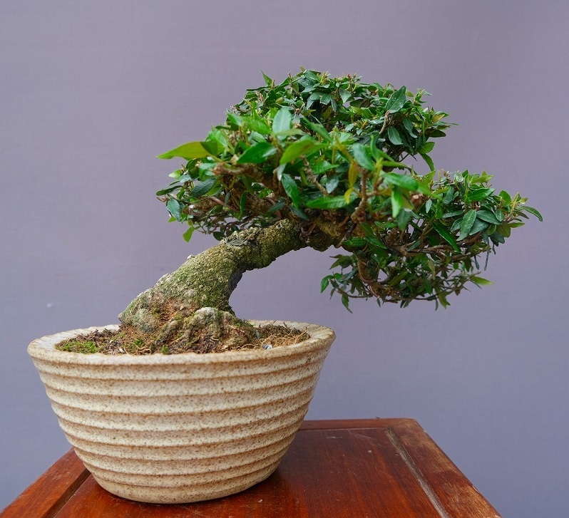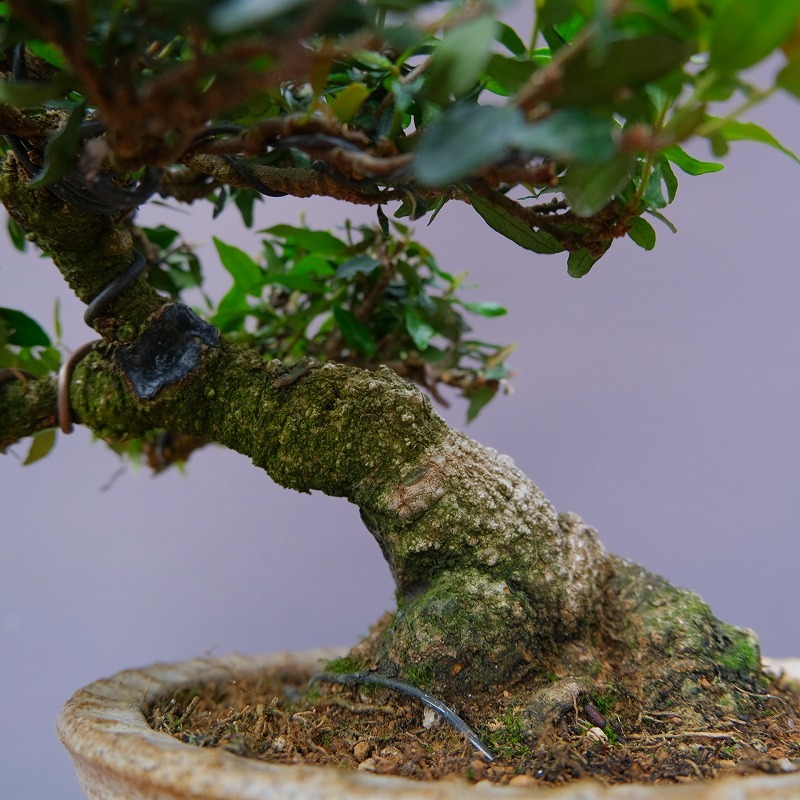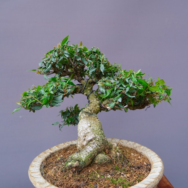 | 説 明 | 太い足元が左右に張り、安定感が生まれています。古色を帯びた木肌、繊細な枝ぶりで、小品でありながらも大木の相があらわれています。 |