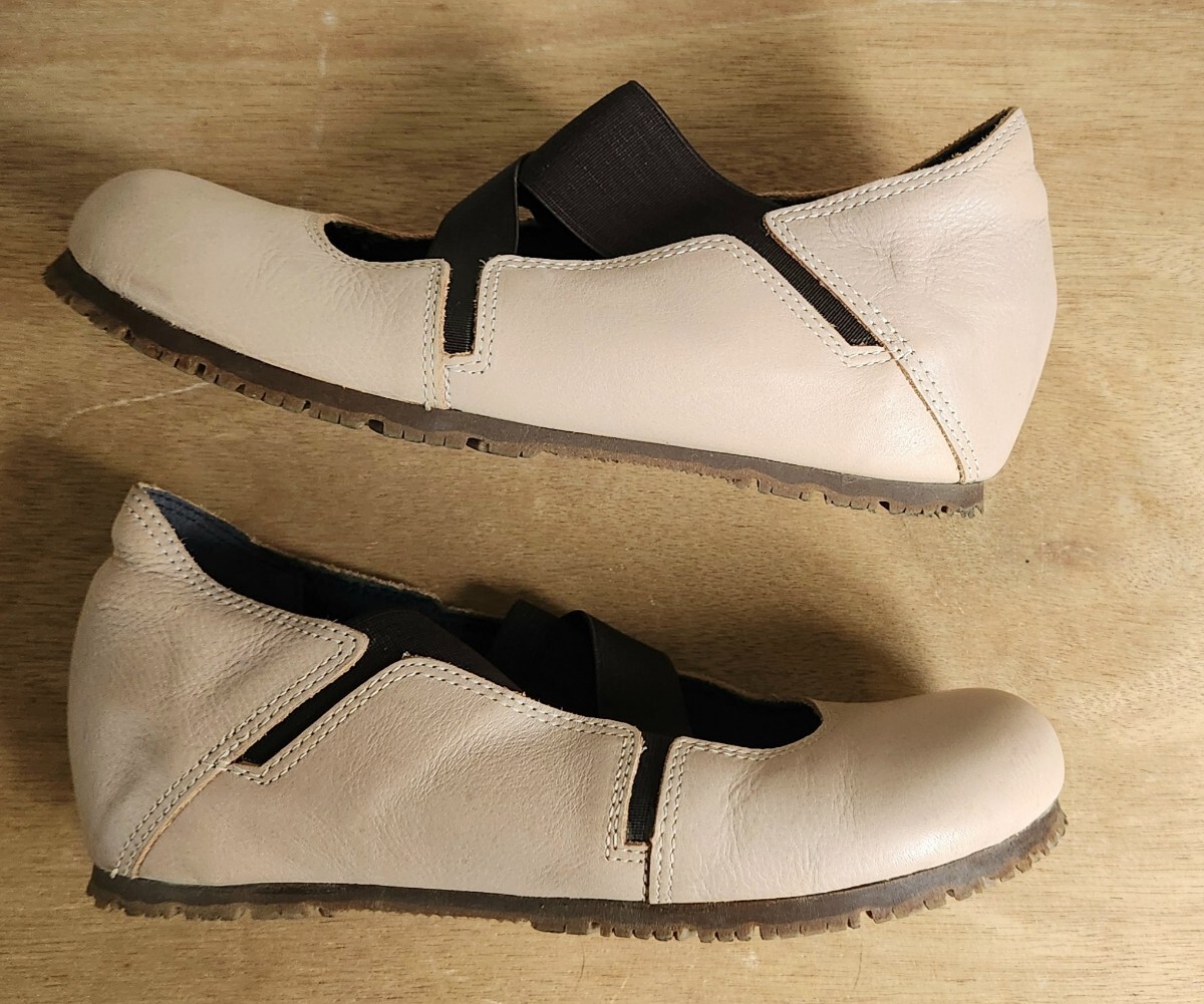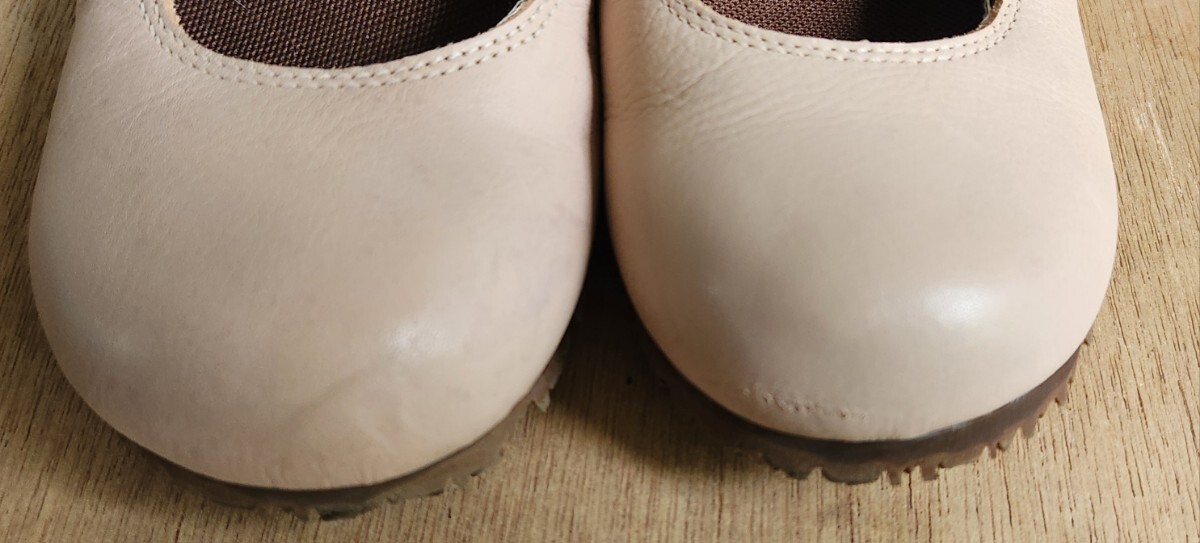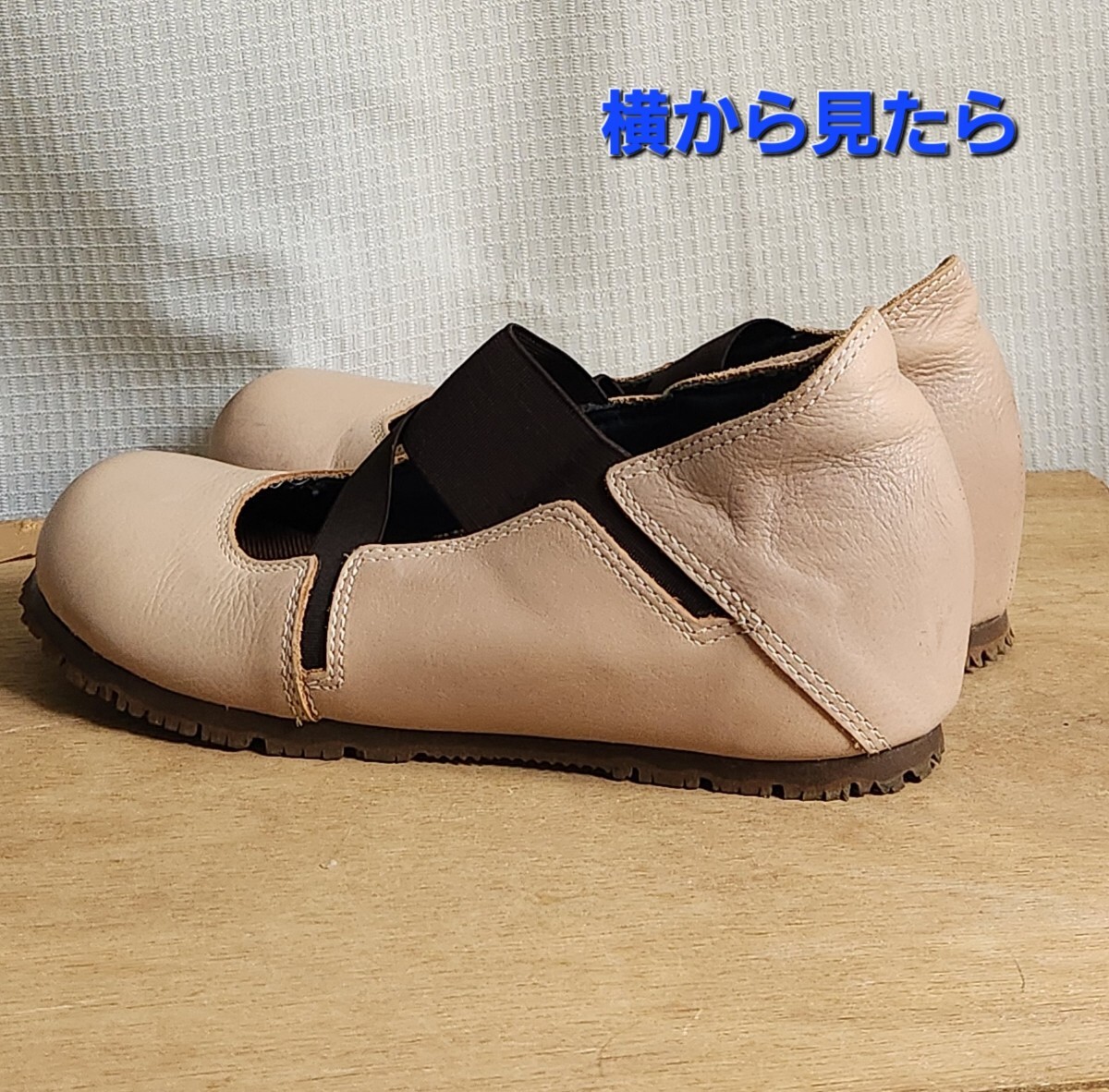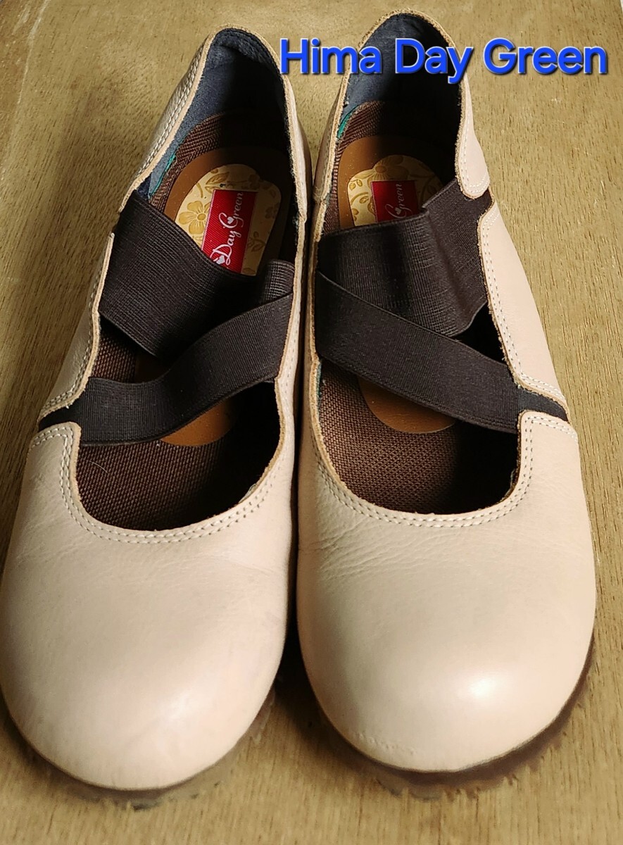 可愛い変形メリージェーン。クロスされた太ゴムに4Eと履きやすさ抜群。