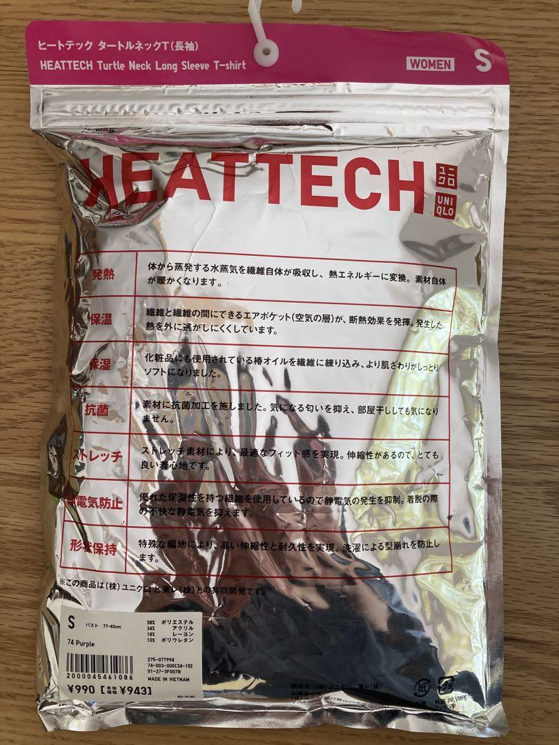 HEATTECHのタートルネック長袖Tシャツ、パープル、Sサイズ。