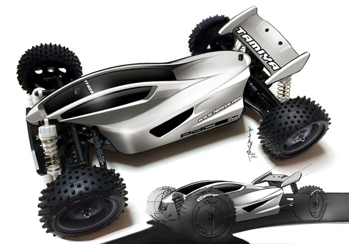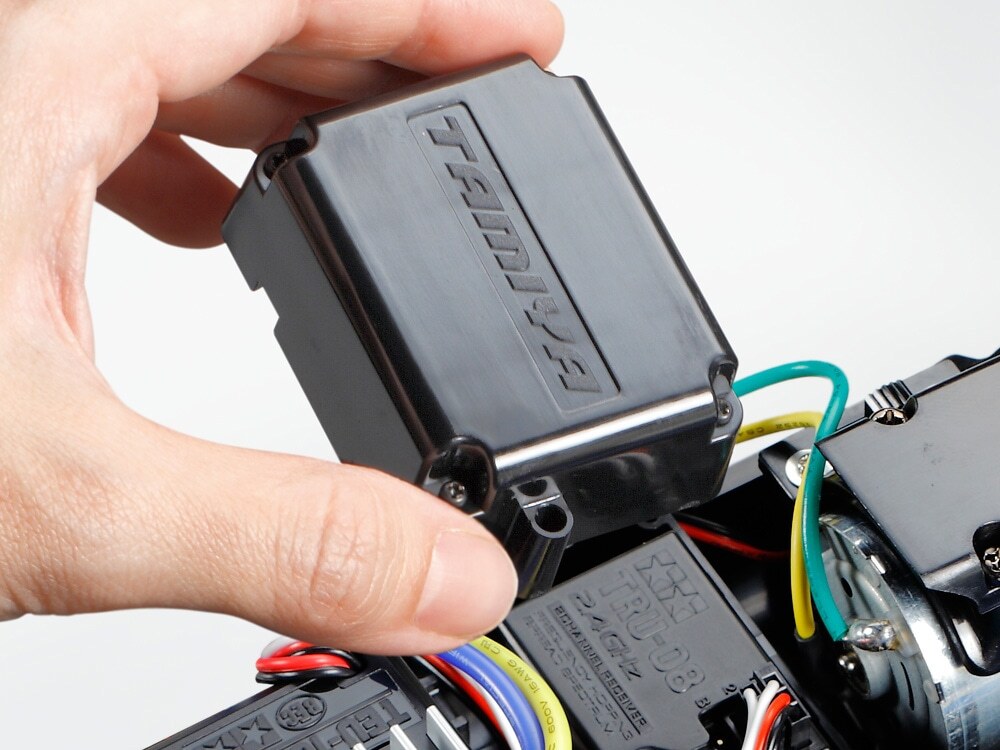 シャフトドライブ4WDを採用したバギー用シャーシ、TT-02Bを採用。バスタブタイプのメインフレームは舟形底面によりスキッド効果を発揮。サスペンションはCVAオイルダンパーを装着したロングアームの4輪ダブルウィッシュボーン。ロードホールディングに優れるとともに、サスアームやアップライトを左右で共通化した組み立てやすい構成です。前後の密閉式ギヤケースにはスムーズな差動の4ベベルタイプ樹脂製デフギヤを内蔵。4本のビスを緩めてギヤケース上部が取り外しでき、整備性も良好です。また、別売りのピニオンギヤ3種類を使えば、標準ピニオンギヤと合わせて4種類のギヤ比が選べ、モーターや路面コンディションに合わせてセッティングが可能。さらに、オフロード走行には欠かせない、ホコリなどを防ぐ受信機用ケースやモーターカバーも装備、走りの信頼性を高めています。