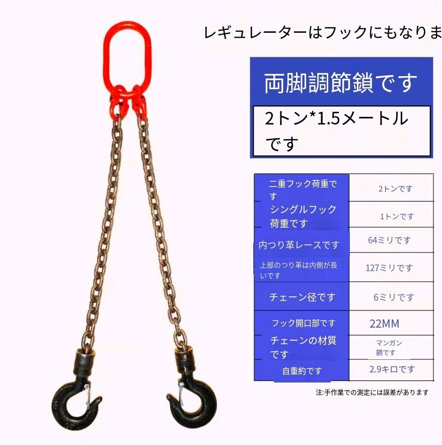 実用品★運搬作業用に チェーンスリング スリングフックタイプ G80マンガン鋼製 使用荷重2t 2本吊り ェーン径6mm 長さ1.5m