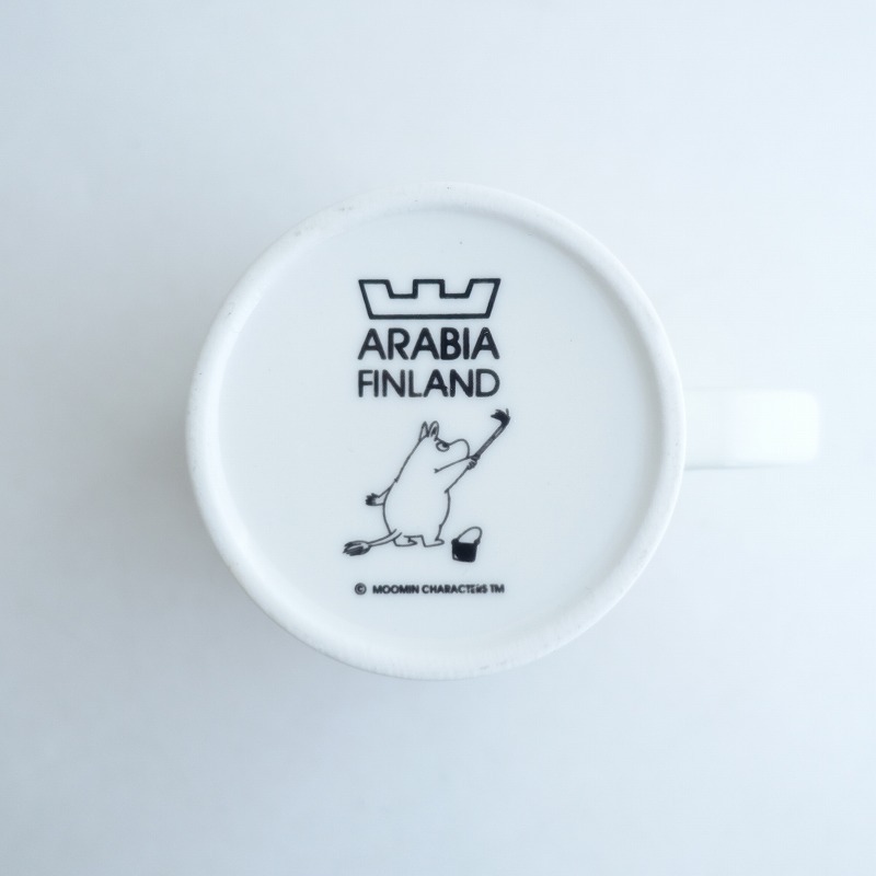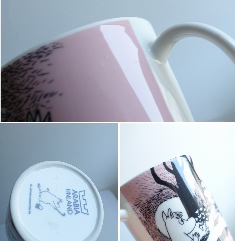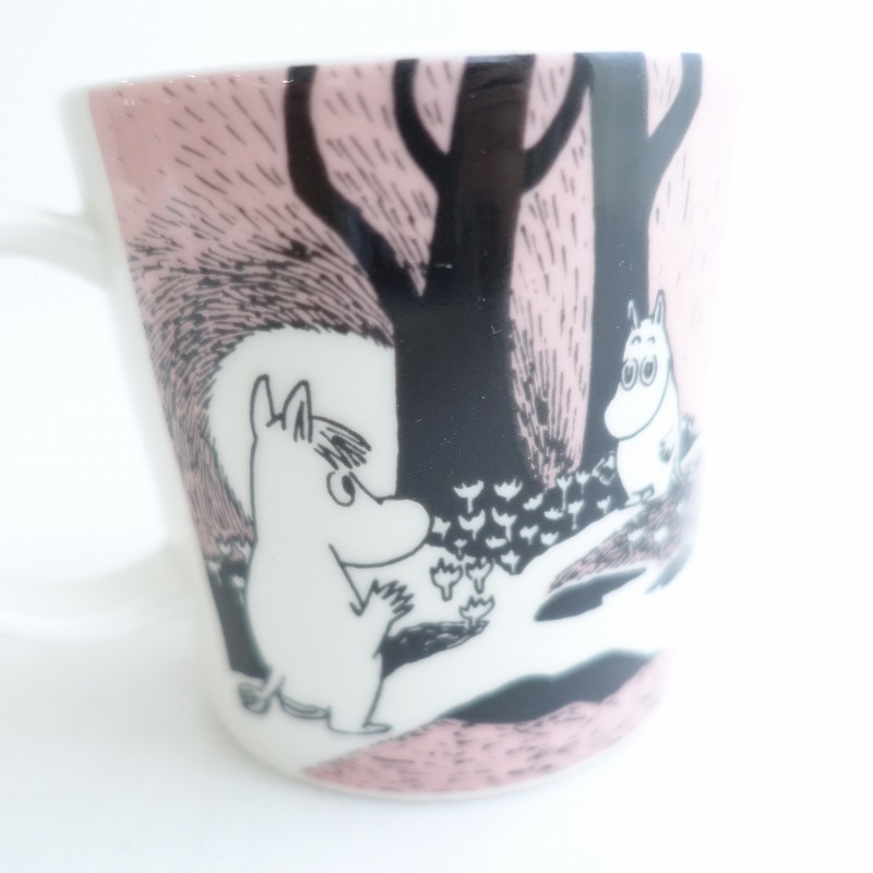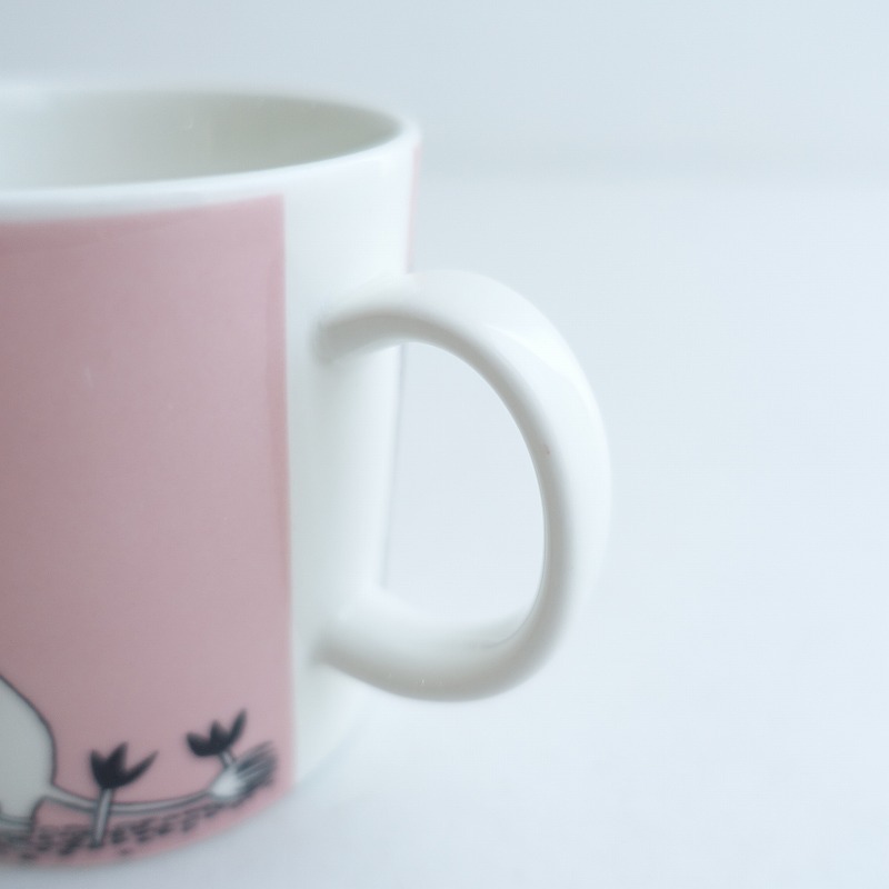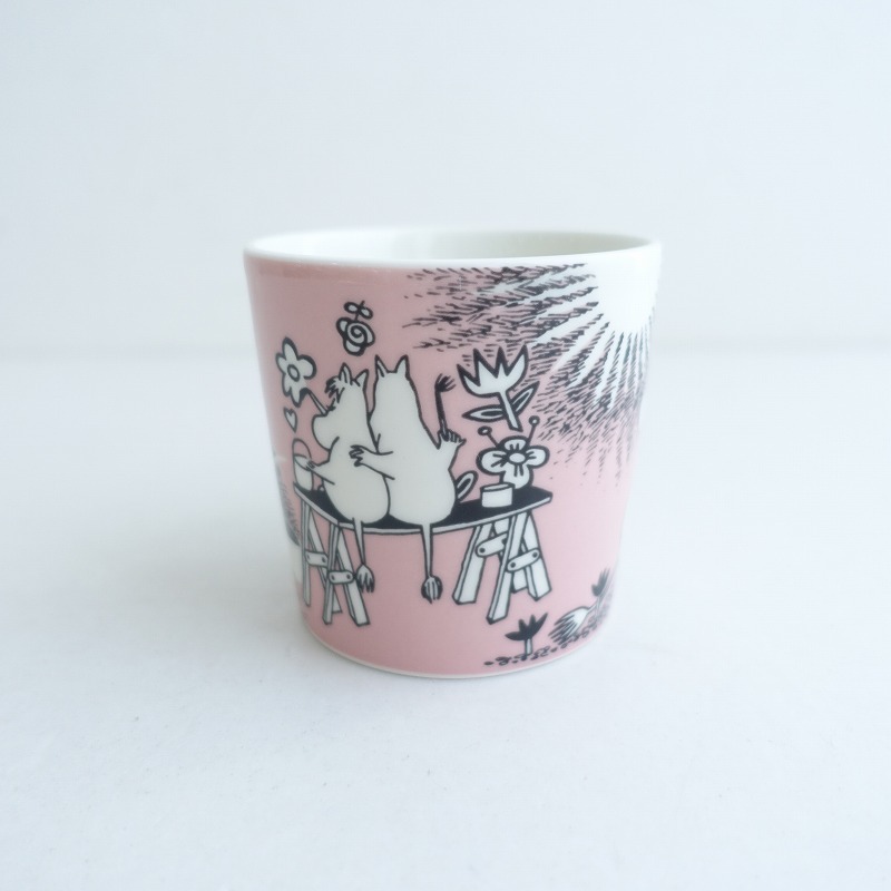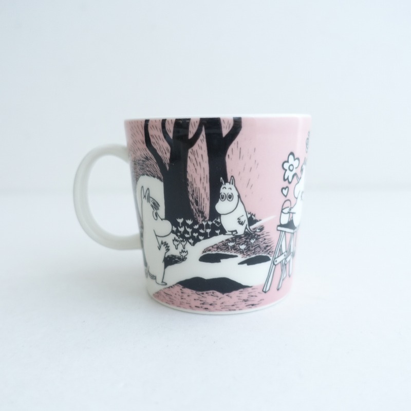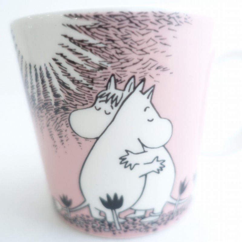 | 旧ロゴ/ARABIAのムーミンマグ ラブ ピンクです。 カラーはピンクベースにホワイト、ブラックでムーミンとスノークのおじょうさんの仲睦まじい姿が描かれています。 |
