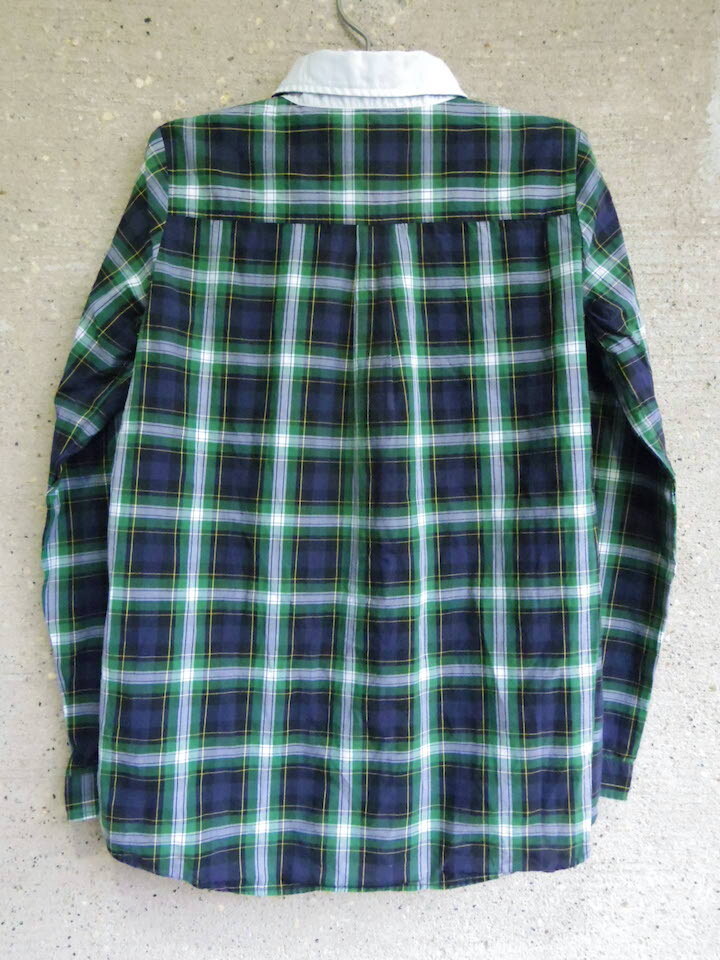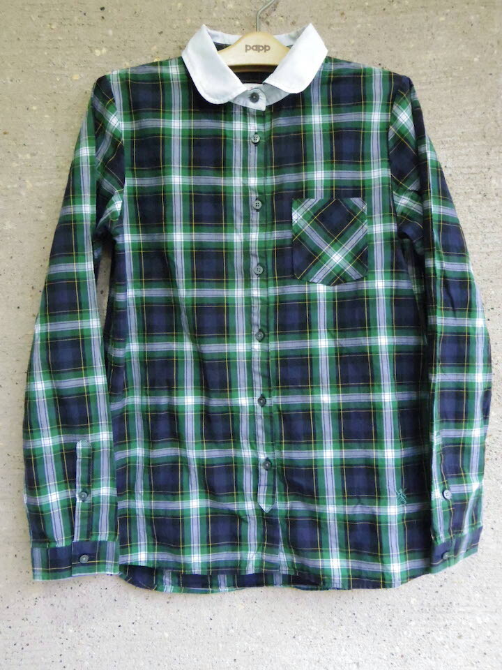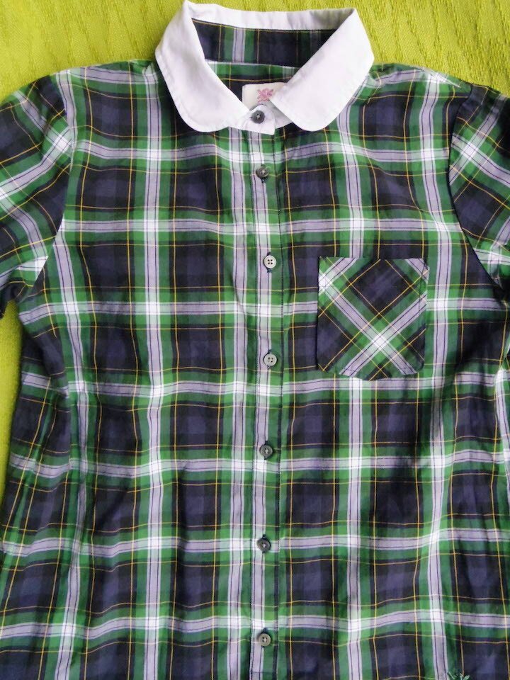 ネイビー グリーン のチェック に 白襟のクレリックシャツ