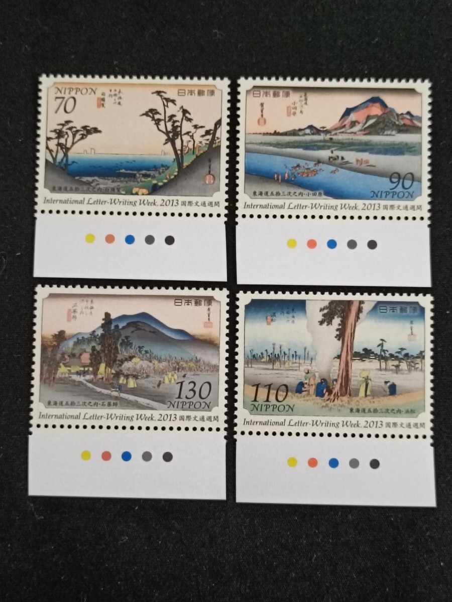 ★国際文通週間。(2013年)。平成25年。美品。広重画「東海道五拾三次」。4点set。文通週間。平成切手。記念切手。切手。
