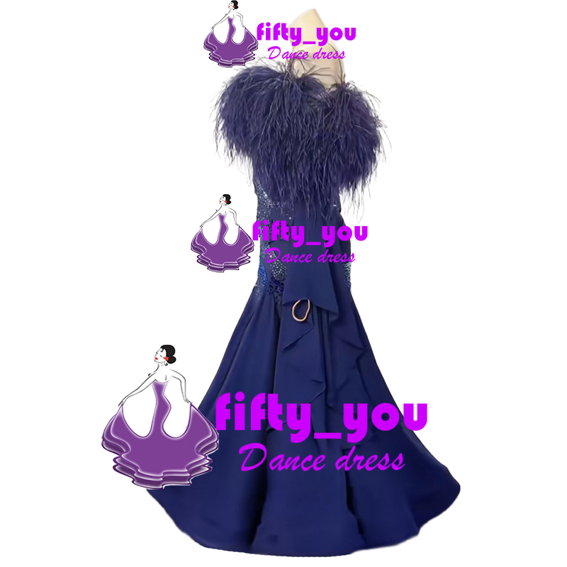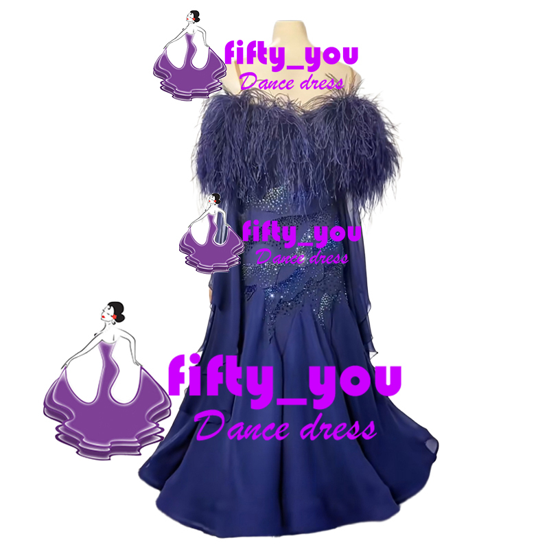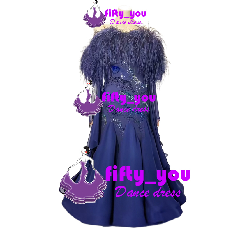 新品fifty_you 競技パーティー用素敵ドレス  レディース社交ダンス衣装  セミオーダー スタンダードドレス ボリューム羽付き 紺色
