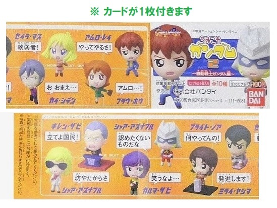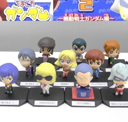 アイテムは、ちまこれガンダム2~機動戦士ガンダム編「アムロ・レイ」「フラウ・ボウ」「セイラ・マス」「カイ・シデン」「ブライト・ノア」「ミライ・ヤシマ」「シャア・アズナブル」「ガルマ・ザビ」「ギレン・ザビ」「シャア・アズナブル(私服)」全10種です。
