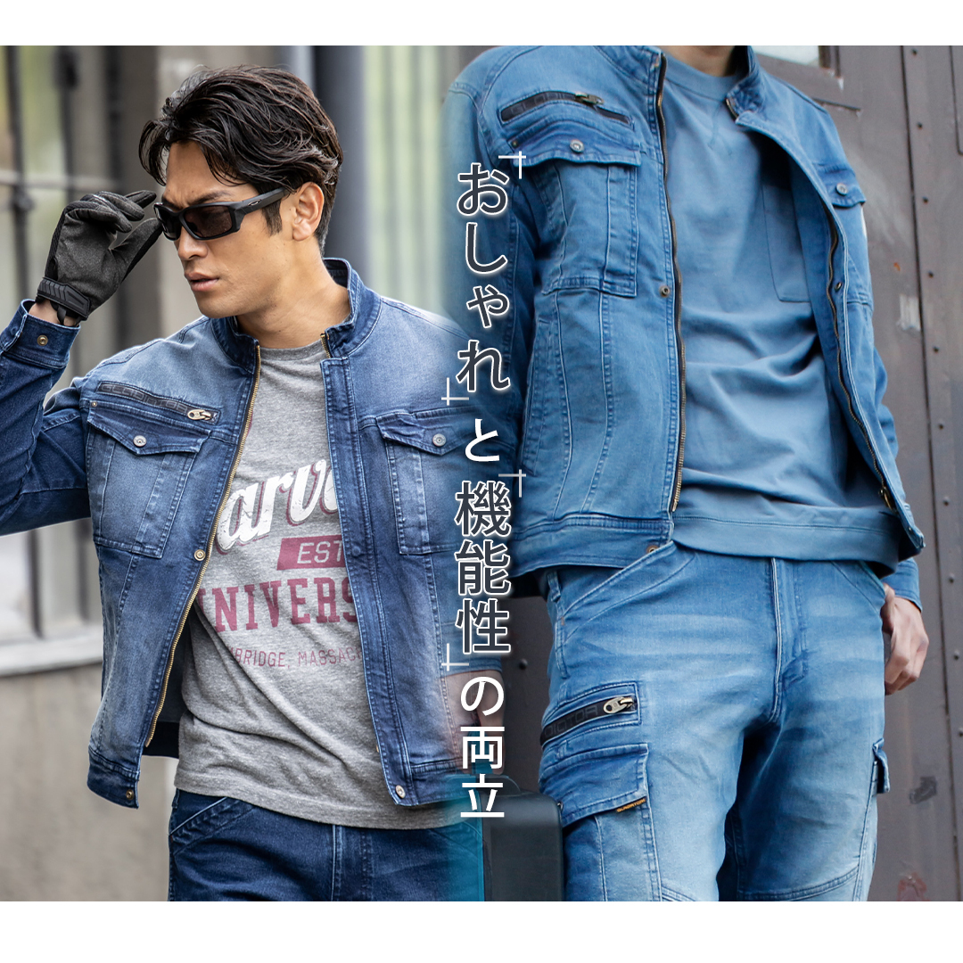 6つのポケットを装備した高い収納力にストレッチ、速乾性などの優れた「機能性」とワイルドでおしゃれな「デザイン性」を兼ね備えたデニムストレッチジャケット。