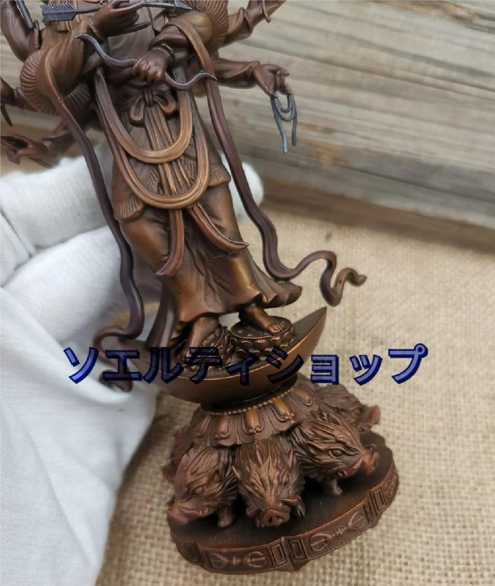 イノシシに乗って素早く移動することで、より傷がつけにくくなるという意味から、戦場の護神として忍者や武士が幅広く信仰していた摩利支天の姿見です。