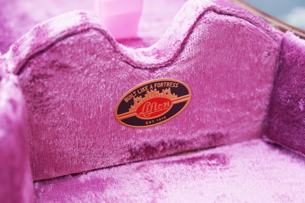 内装がショッキングピンクで厚手のクッション、外装のレザーは艶が無くマットな質感のもの