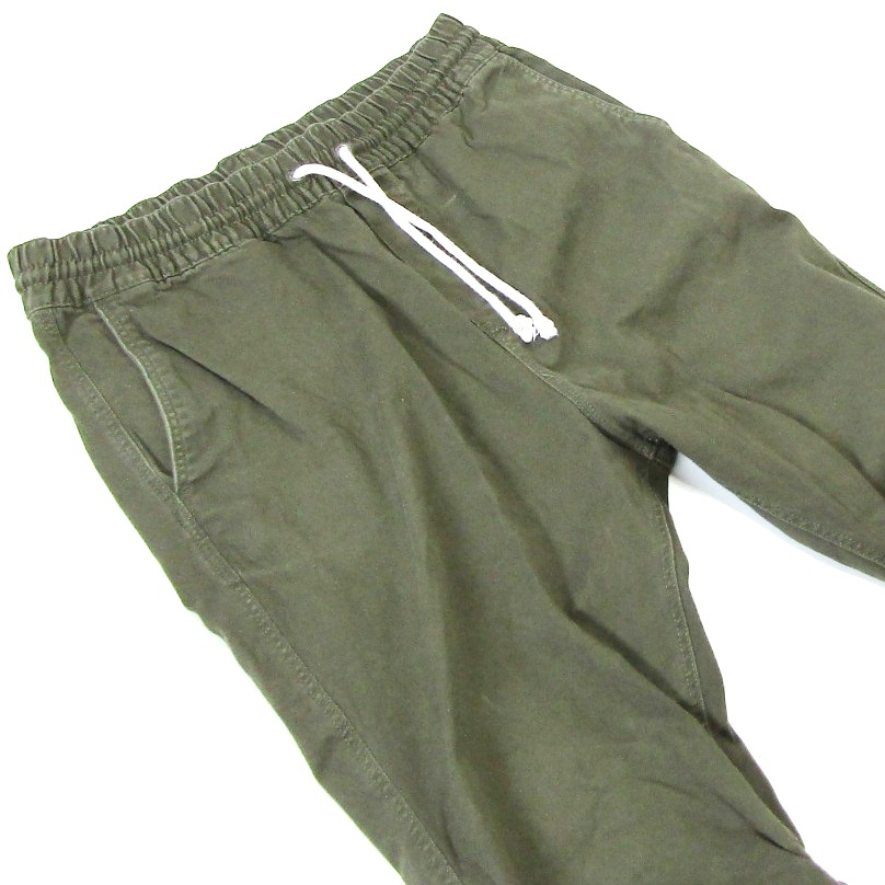 ウエストゴムとドローストリング付きのオリーブ色イージーパンツ。