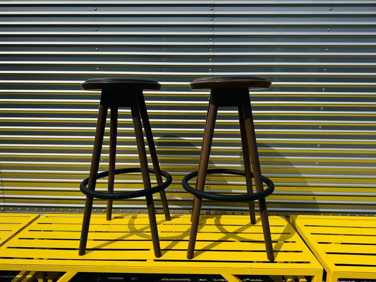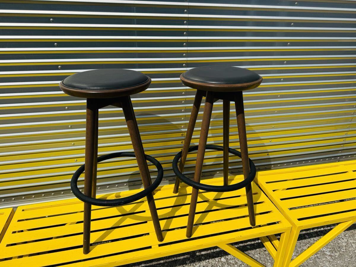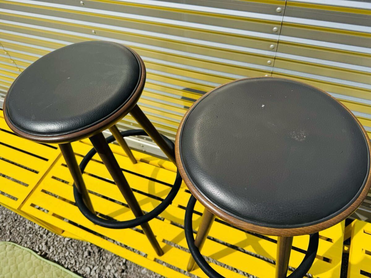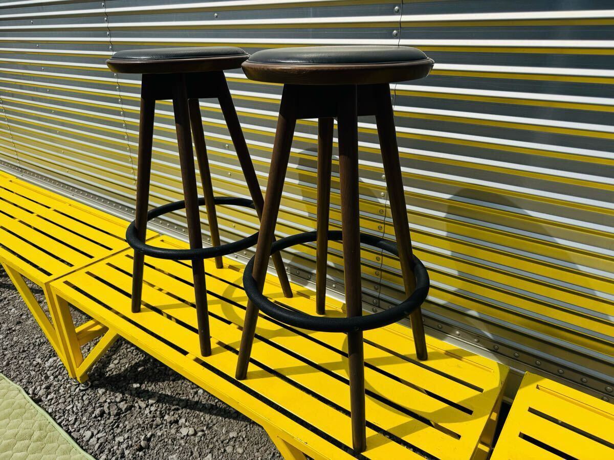 木のフレームと座面のブラックレザー、足置きはアイアンで落ち着きのあるデザインとなっております。