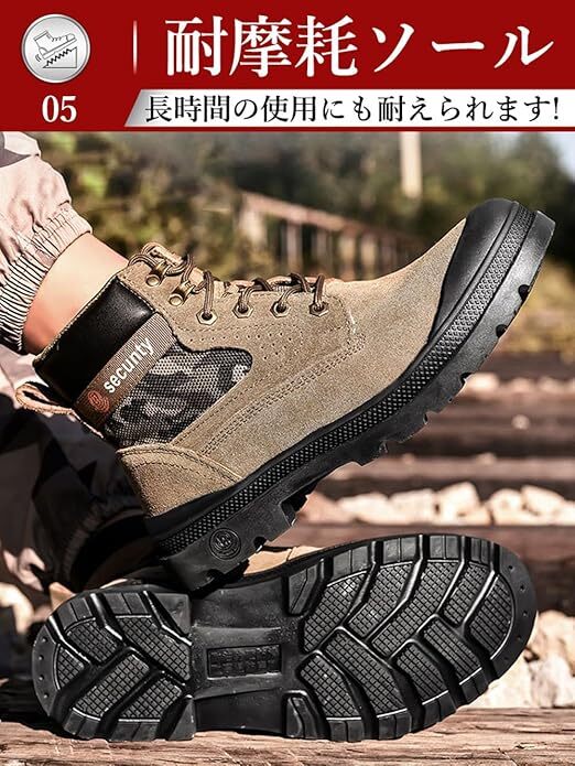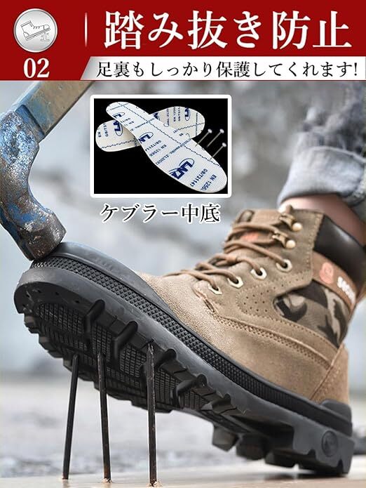 【安全第一】つま先部分には高品質な鋼先芯を入れた、金槌の衝撃や刃物の落下など作業中の事故からつま先を保護できます。鋼製中底を搭載し、足裏もしっかり保護してくれます。