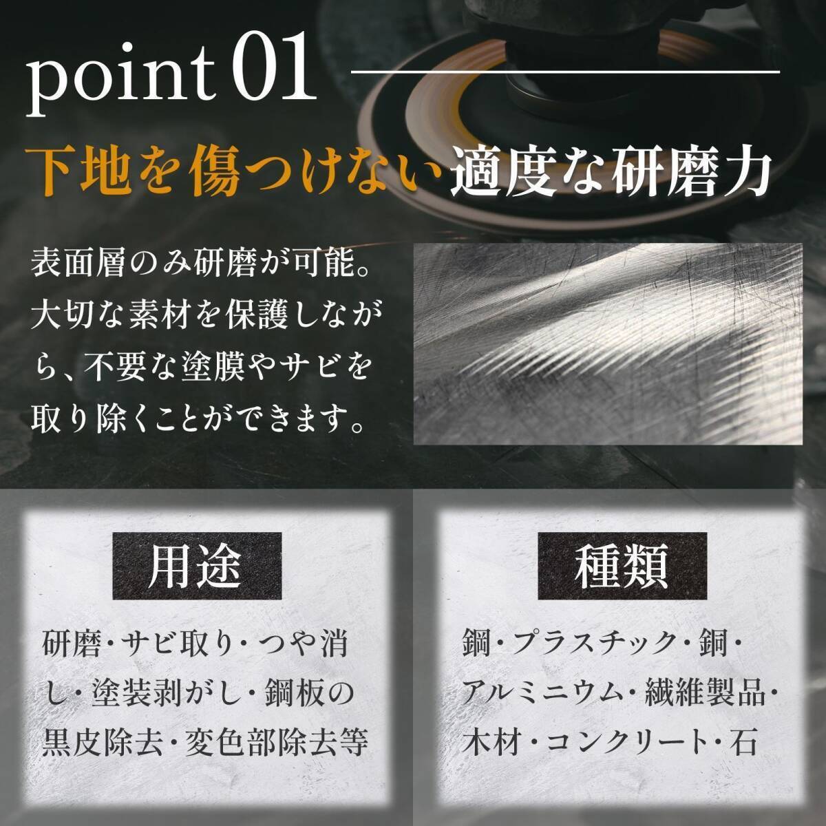※グラインダー研磨において、サビ取りや表面処理作業に非常に優れた効果を発揮します。ディスクグラインダー研磨に対応し、作業中の飛散物が少なく、安全に作業を行うことができます。