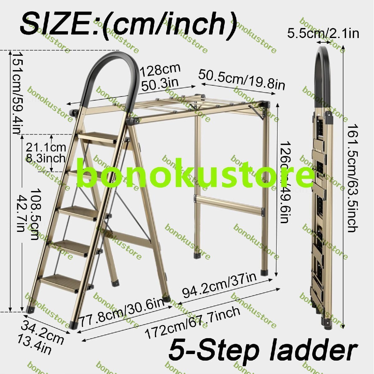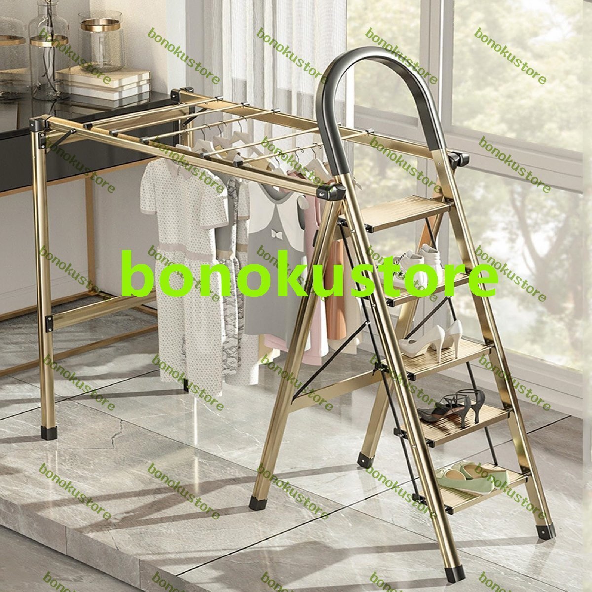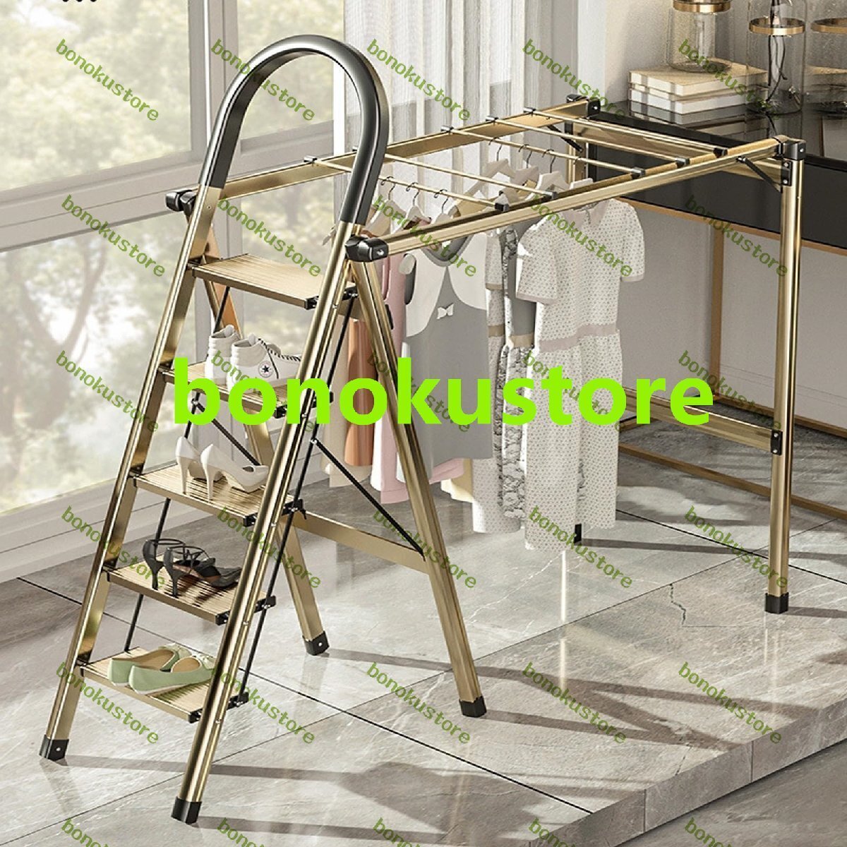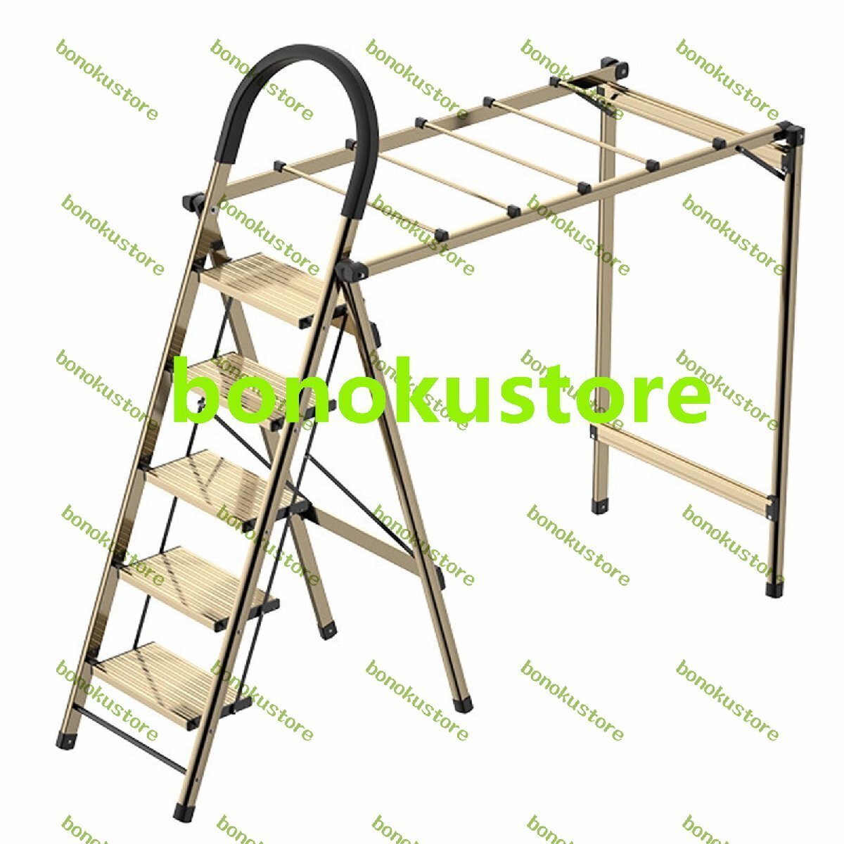 アルミ折りたたみ式室内物干しラック、1つのはしごで2つの用途に使える物干しラックアルミ折りたたみ式、室内用伸縮式はしご物干しラック、バルコニー用室内家庭用はしごランドリーセンター(Gold 5-Step Ladder)