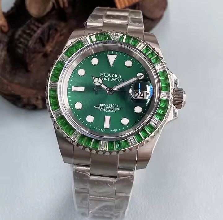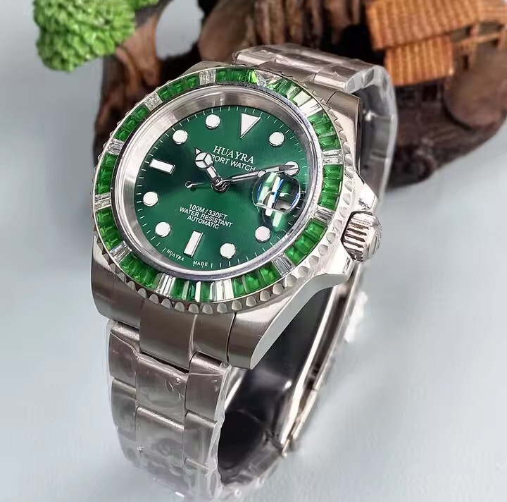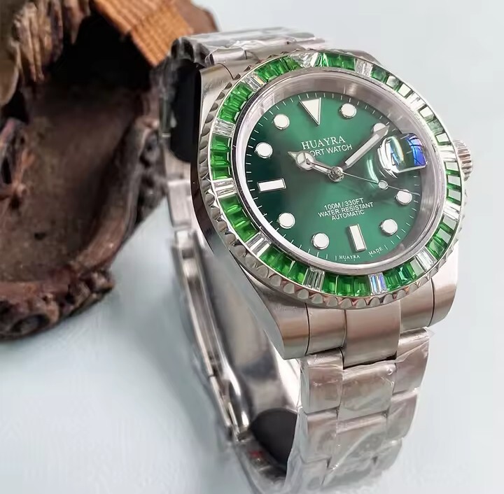 【新品未使用】自動巻き腕時計機械式グリーンキラキラベゼルシルバーベルト防水ビジネスウォッチ機械式