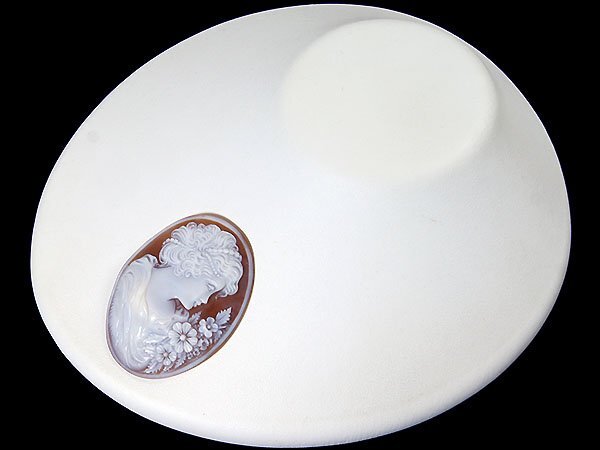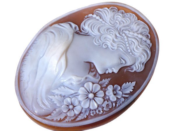 上品な女性と花を繊細に彫刻で演出した、素晴らしい高級シェルカメオルースです!