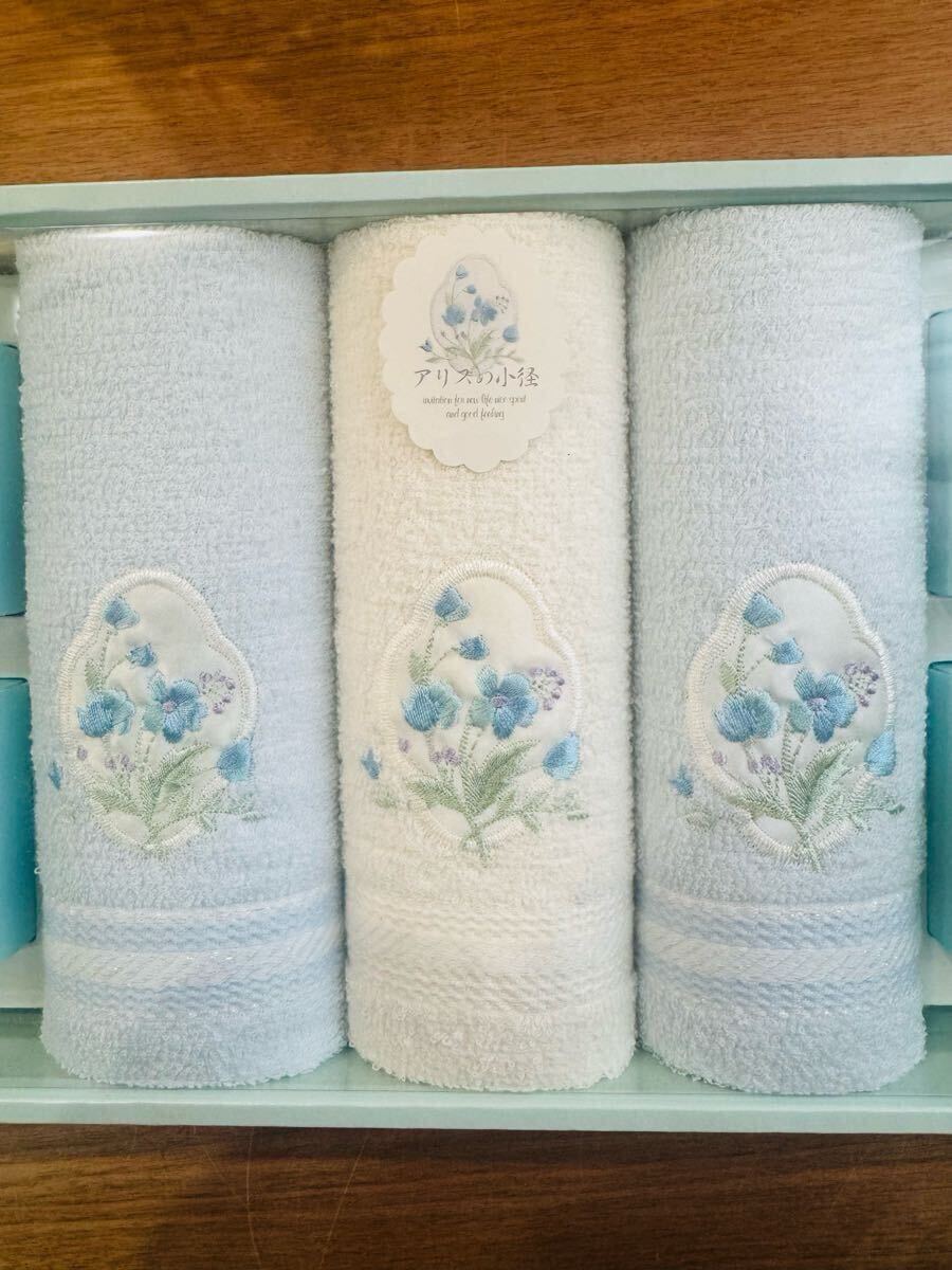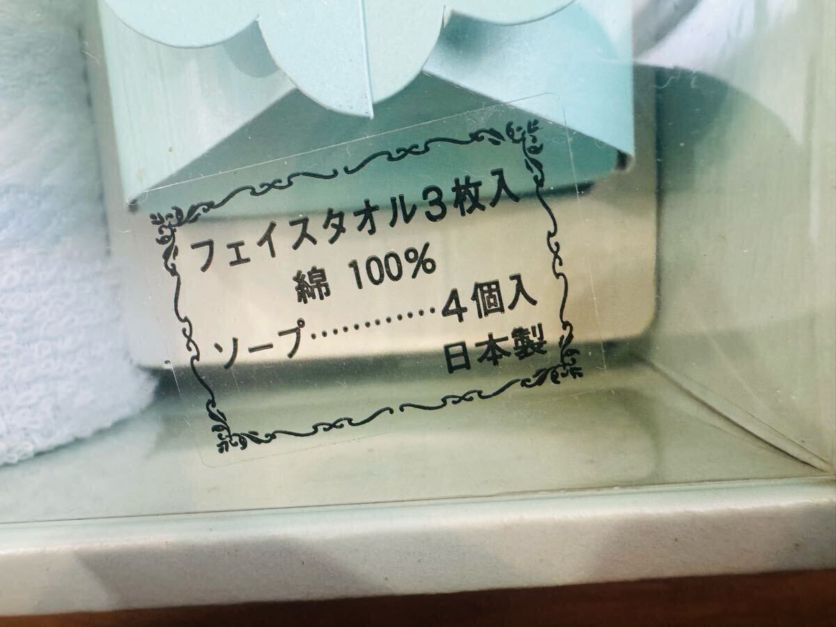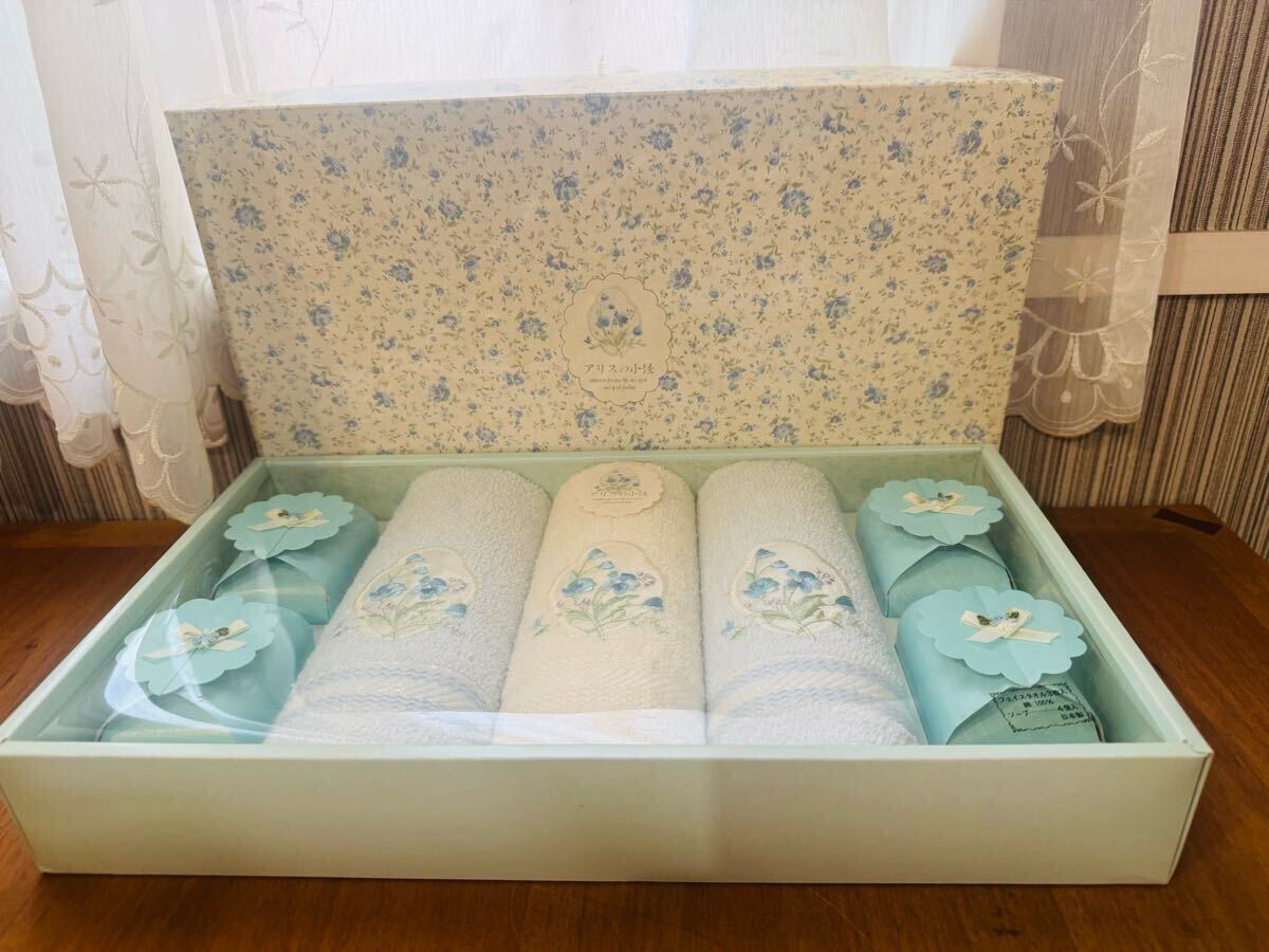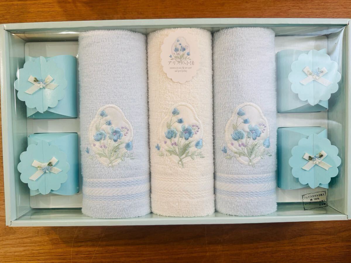 【未使用】アリスの小径 フェイスタオル ブルー ホワイト 3枚 綿100% 石鹸 4個 セット まとめて