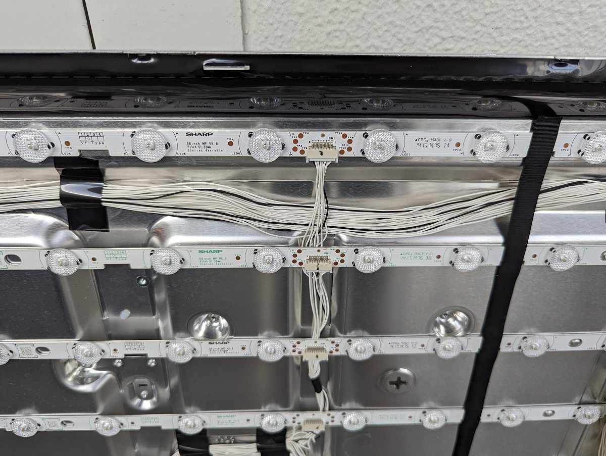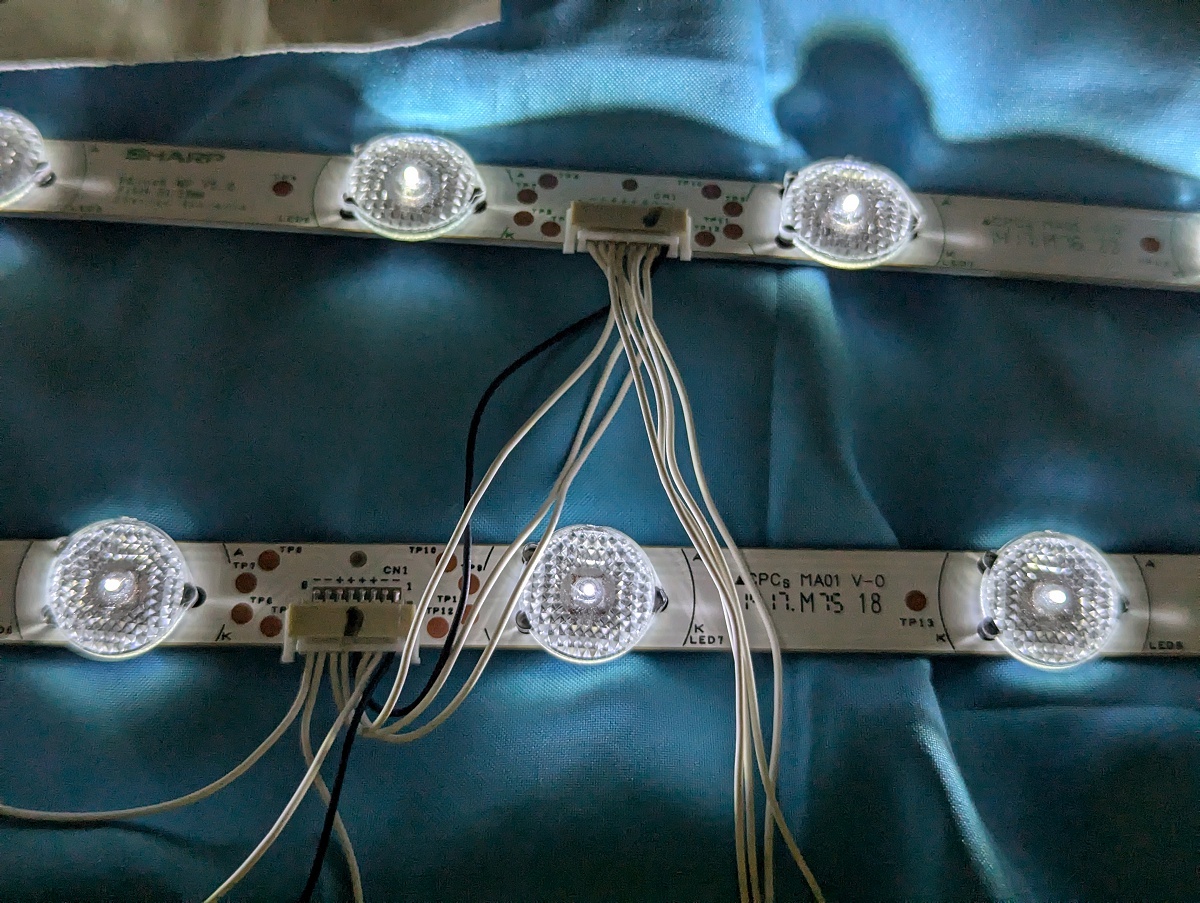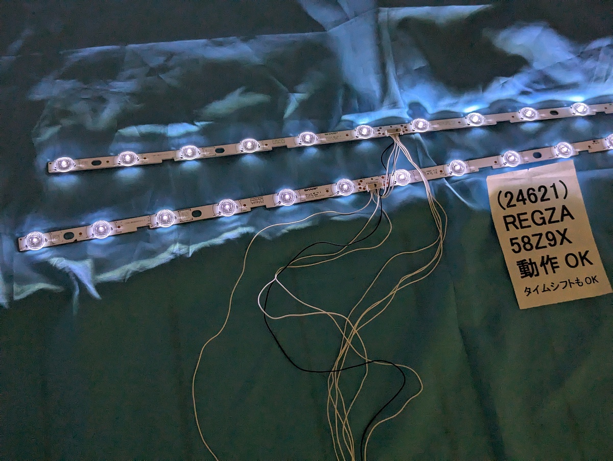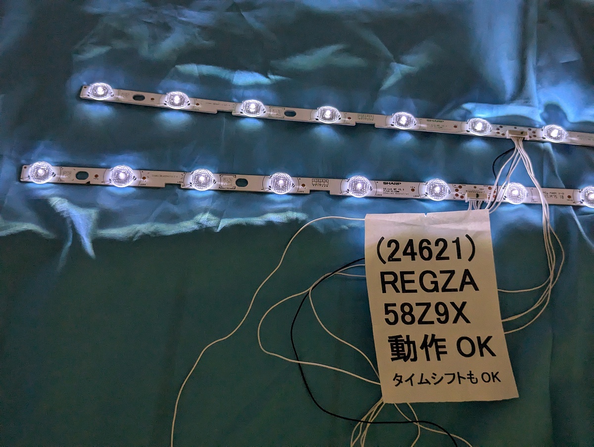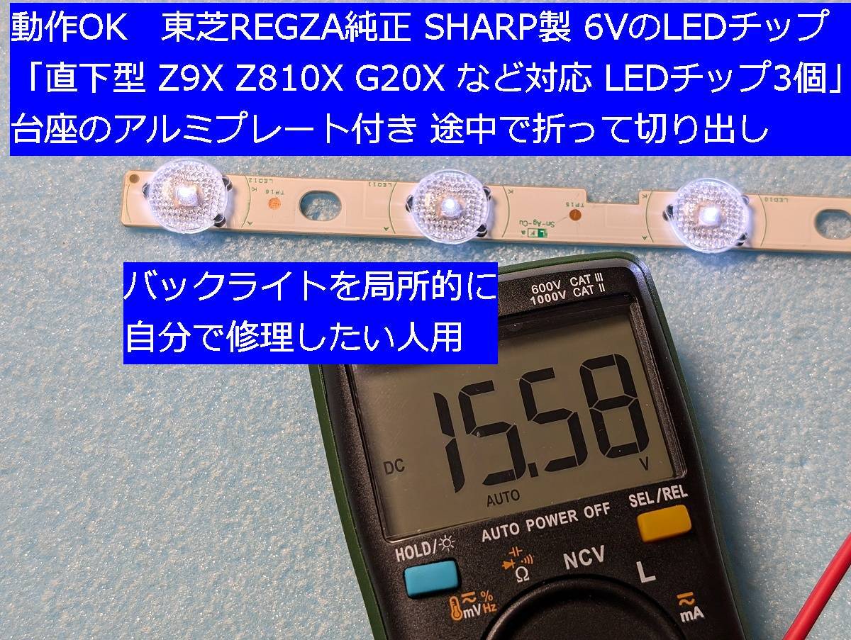送料無料■バックライトを局所的に自分で修理したい人用。動作OK 東芝REGZA純正 SHARP製 6VのLEDチップ「直下型 Z9X Z810X G20X など対応 LEDチップ3個」台座のアルミプレート付き 途中で折って切り出し テレビのパーツ LEDバーの基板に書かれた型番 SHARP 58inch MP V5.0 pitch 51.52mm 3series 4parallel です。12個のLEDが、ついているうち、3個だけを分離して、お送りします。すべて動作テスト済みです。そのままでは使えません。加工が必要です。そのまま使える1本のバーは、別途出品しています。 |