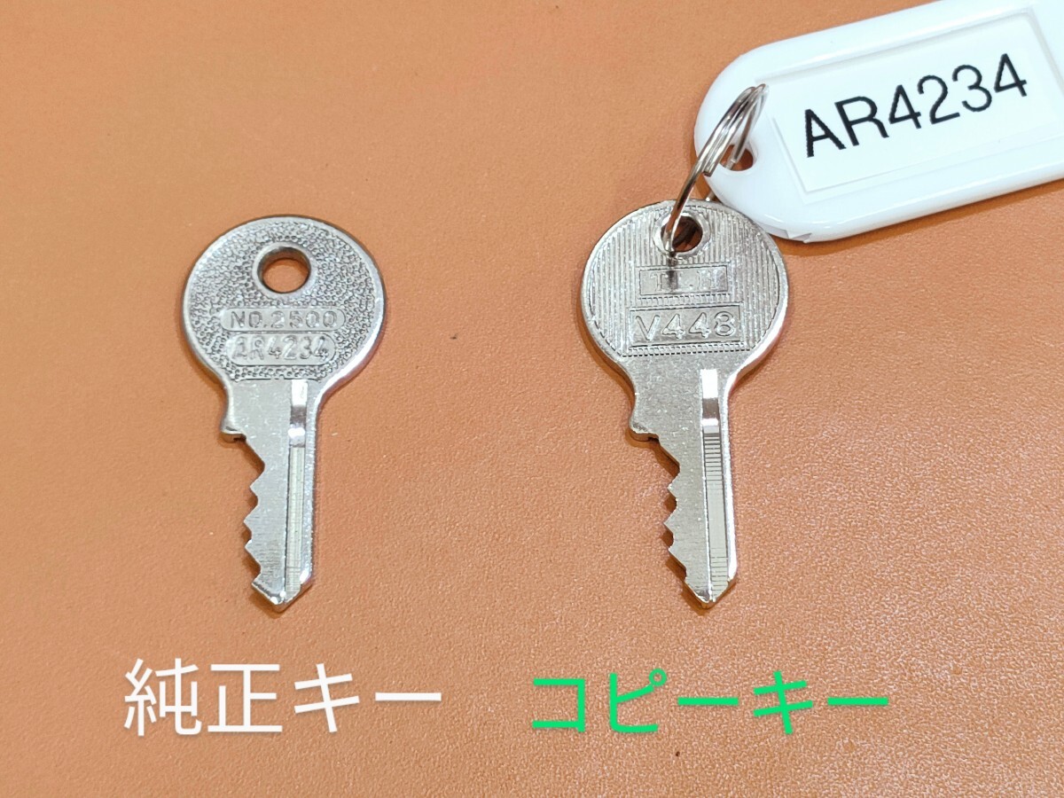 AR4234の合鍵1本と、カギ番号が記載したキーホルダー付き(※キーホルダー:色はお任せ)。