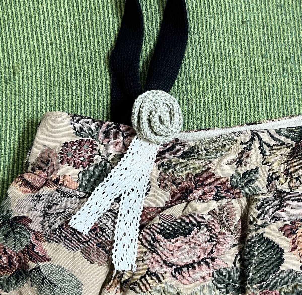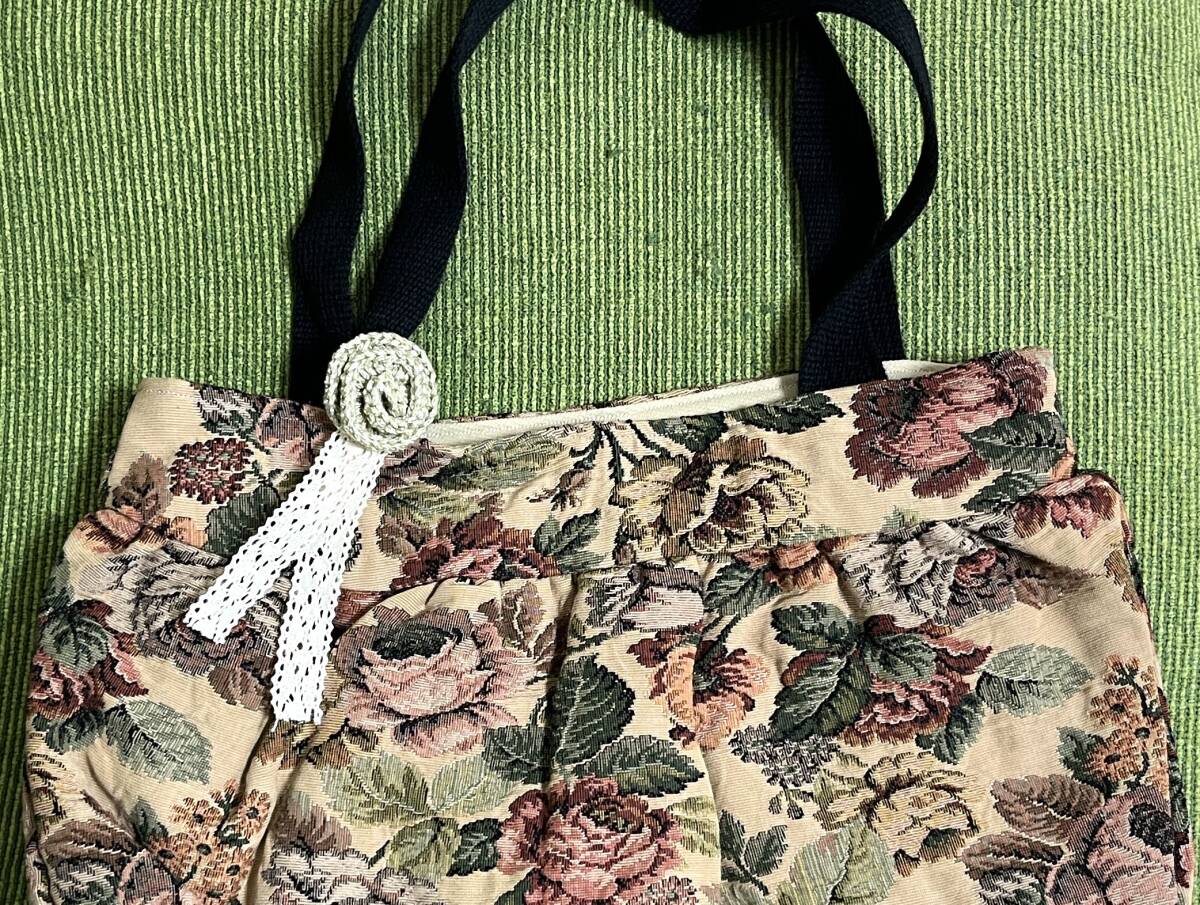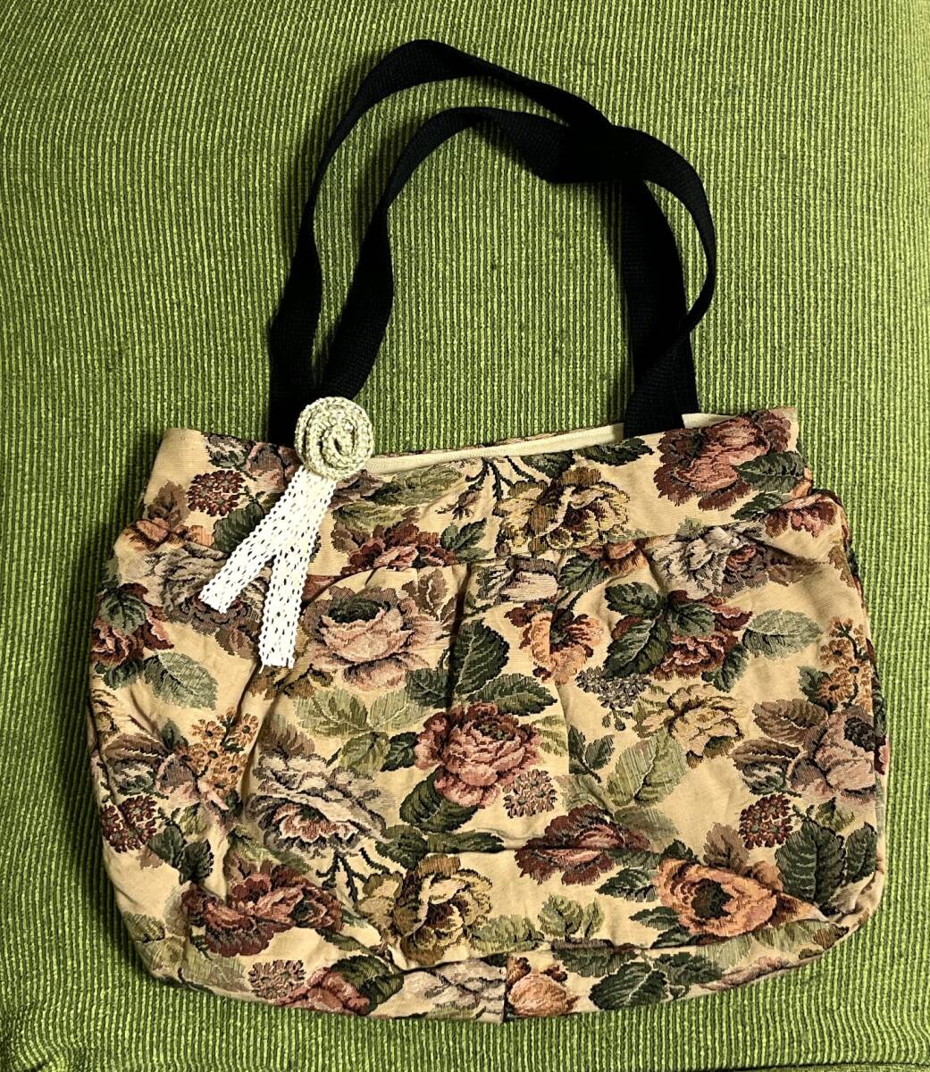 かぎ針編みで編んだバラのモチーフをバッグチャームとして、つけました。(取り外し可能です。)