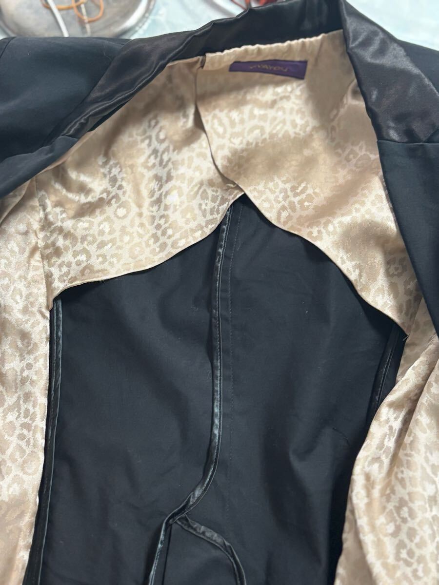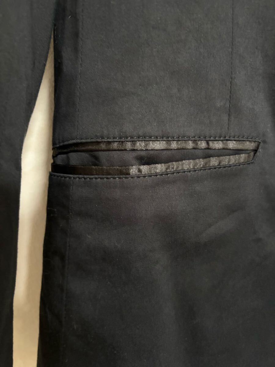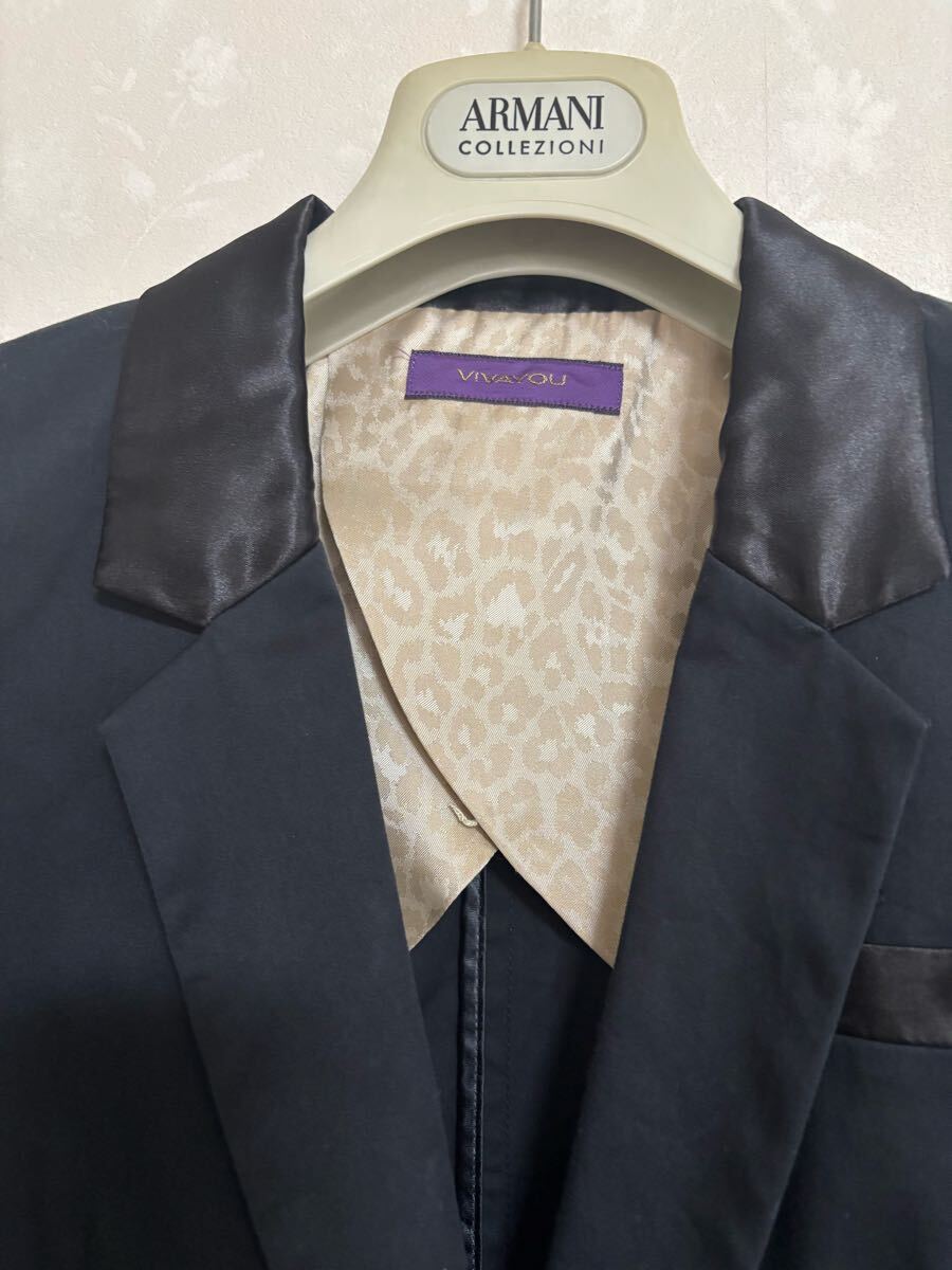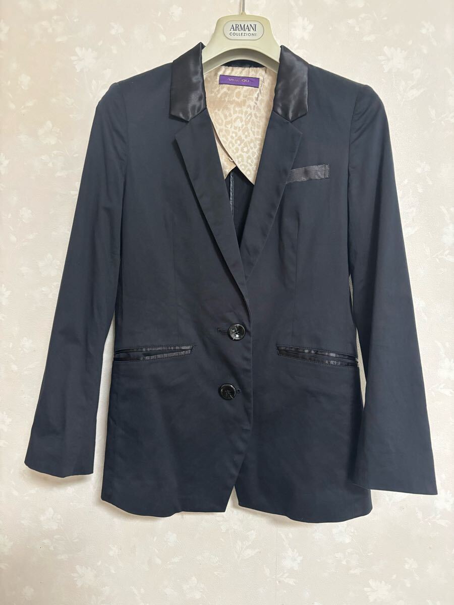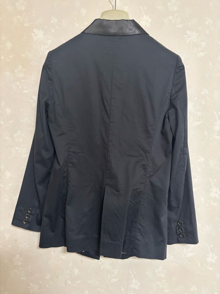 サテン襟付きのブラックテーラードジャケット、洗練されたデザインが特徴です。