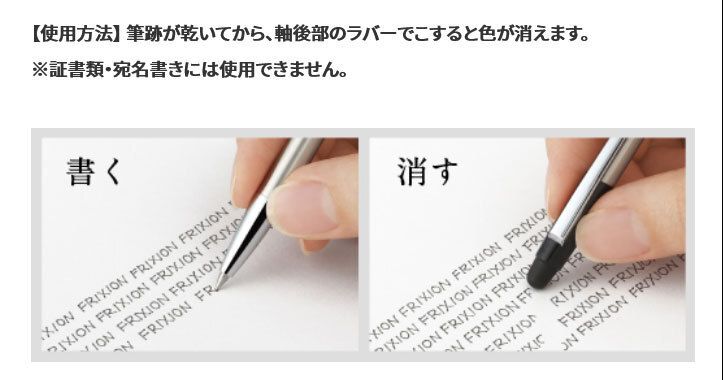 【使用方法】 筆跡が乾いてから、軸後部のラバーでこすると色が消えます。