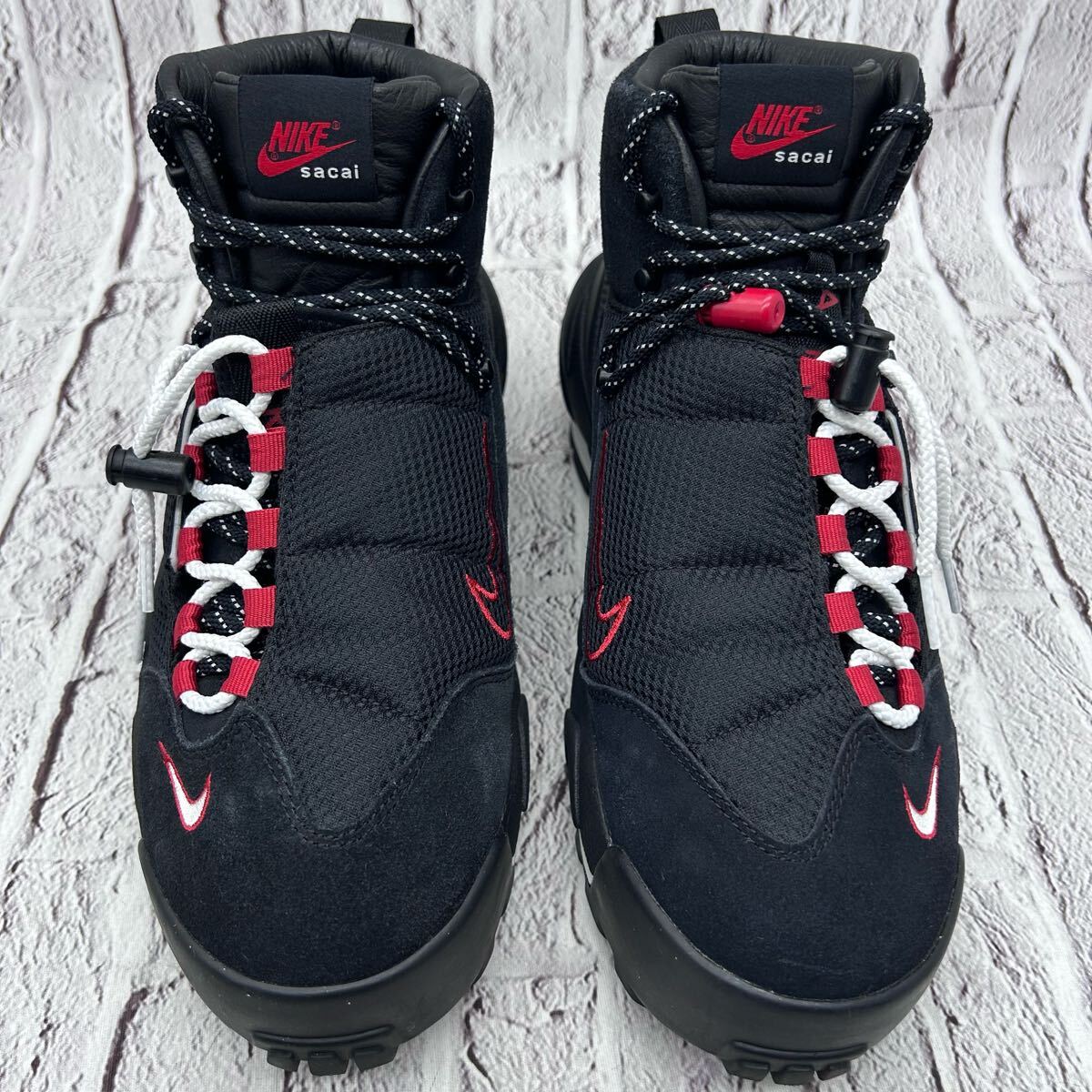 「MAGMASCAPE SP/SACAI」の登場です。1981年に登場したナイキ初のアウトドアシューズ「AIR MAGMA」と1995年に登場した「AIR FOOTSCAPE」を組み合わせた「MAGMASCAPE」は、頑丈な作りのアウトソール、丸紐のシューレース、スエードのパネルは、「AIR MAGMA」から、風通しの良いテキスタイルとアイコニックなサイドのシューレースデザインは、「AIR FOOTSCAPE」からヒントを得てデザイン。さらに、二重のアイステイには2本のシューレースを通せるので、好みのフィット感に簡単に調節可能。シューレースロックでしっかり固定できます。