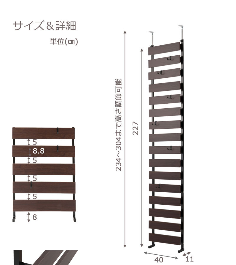 ■商品サイズ/本体:(約)幅40×奥行9(脚部11)×高さ234~304cm、ラダー間隔 :(約)ラダー高さ8.8・すきま5cm、目隠し部高さ:(約)227cm
