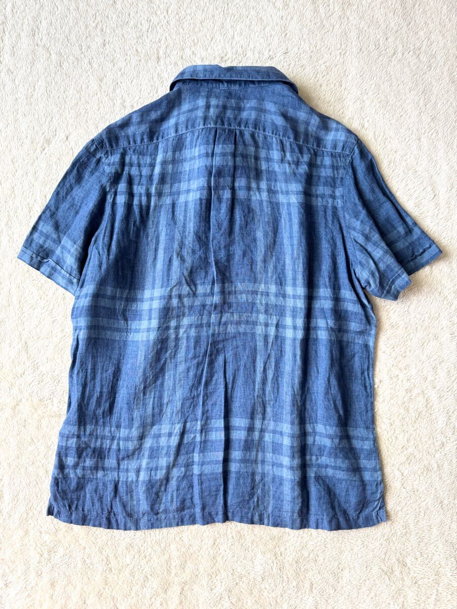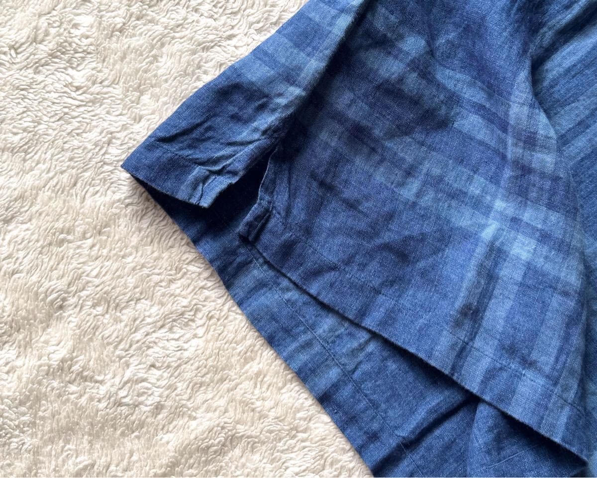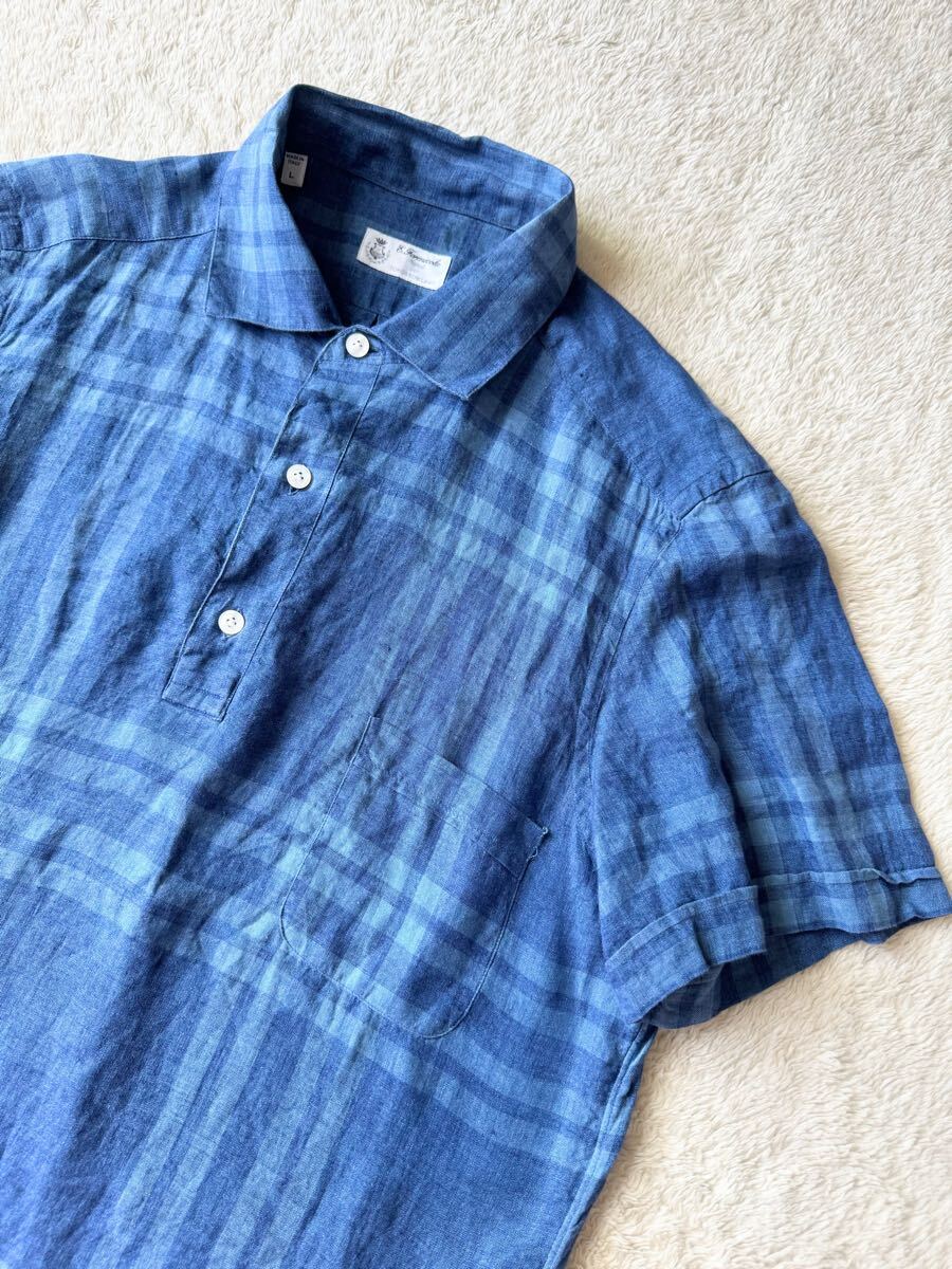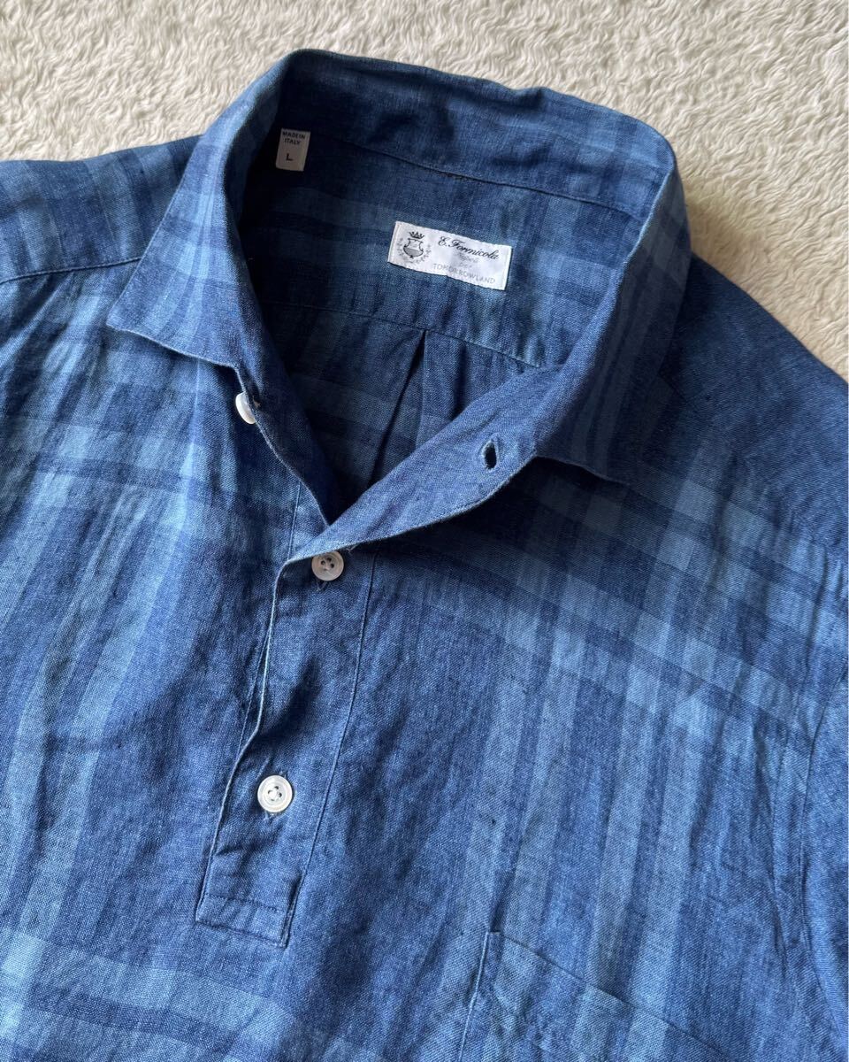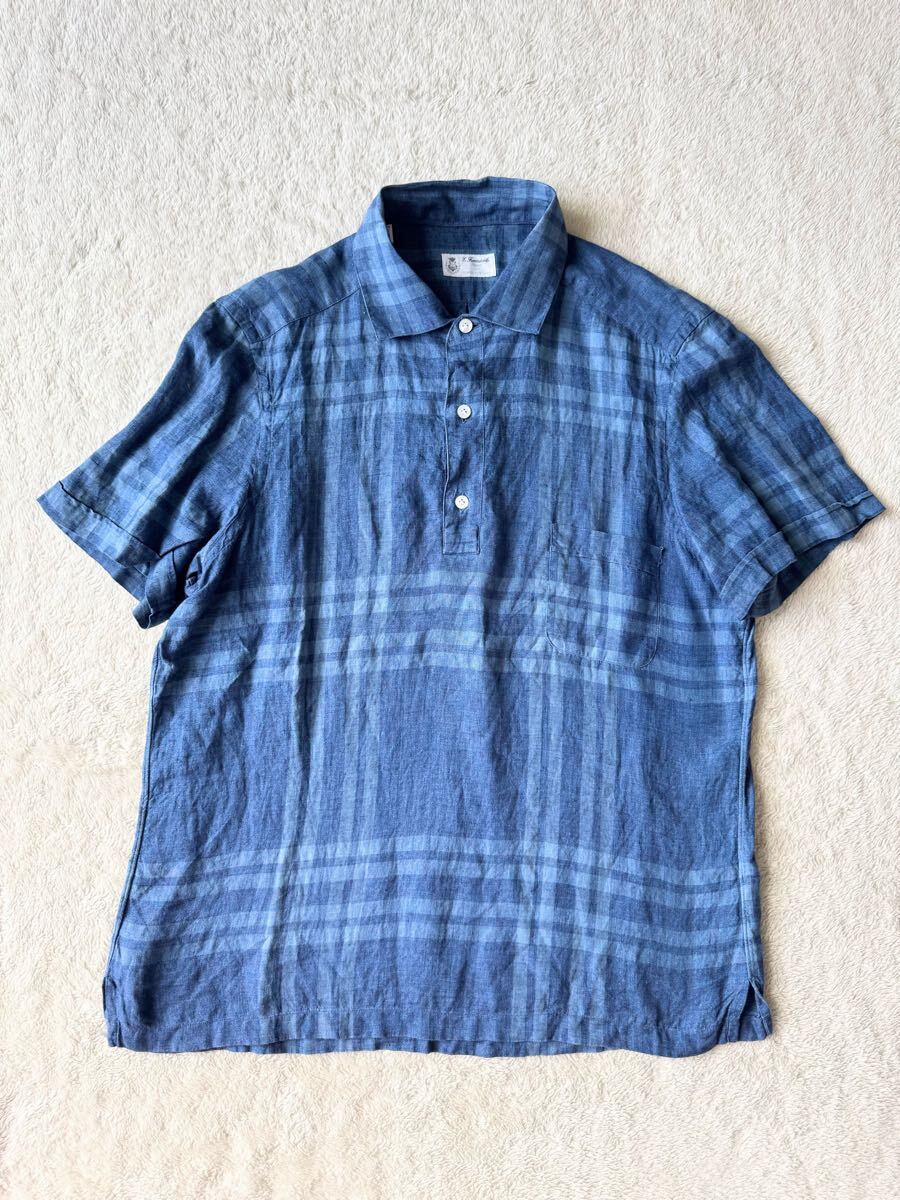 別注 E.Formicola sizeL イタリア製半袖リネンシャツ メンズ ブルー プルオーバーシャツ フォルミコラ チェック インディゴ