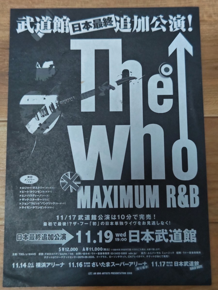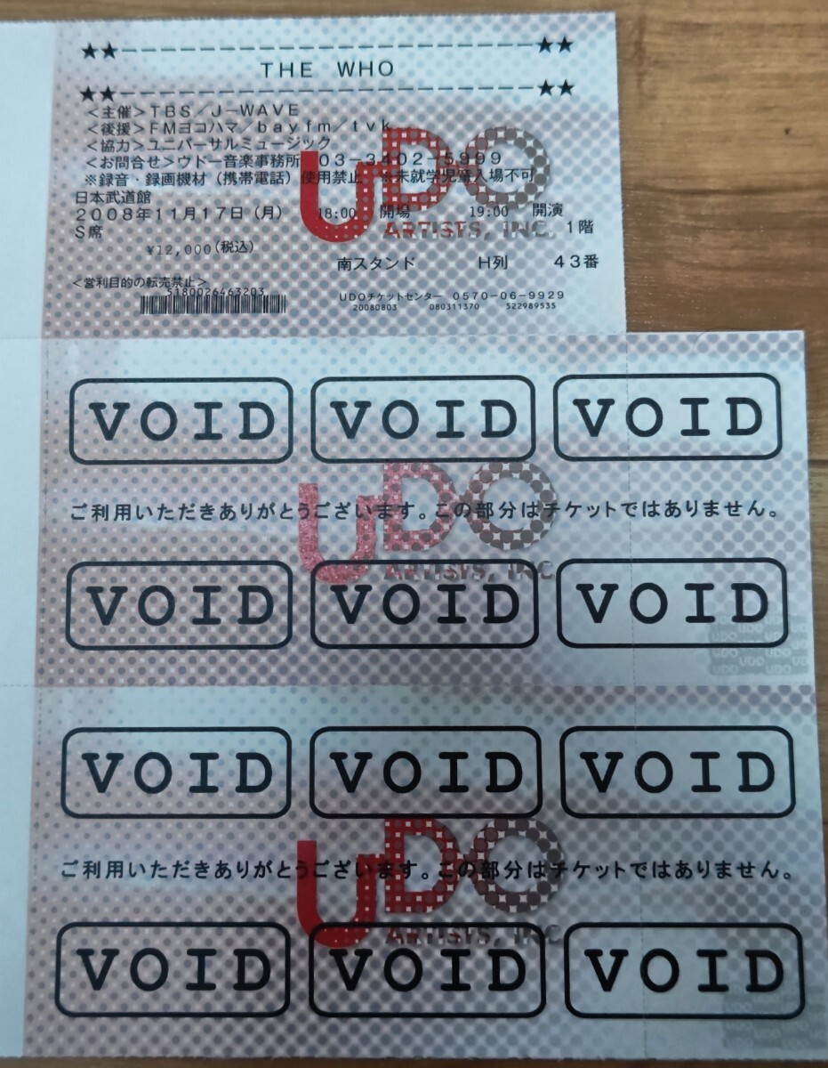 THE WHOの2008年11月17日来日時の日本武道館チケット、公演時のチラシ、当日購入したラミネートになります。ラミネートは19×26.2センチです。最近もドラマーのドタバタがありますが、お好きな方はよろしくお願い致します。定形外郵送致します。送料込みです。