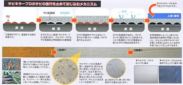 従来のサビ転換塗料は、サビている所にしか使えませんでしたが、この塗料はサビていない所にも、シーラー・プライマーとして使用可能です。