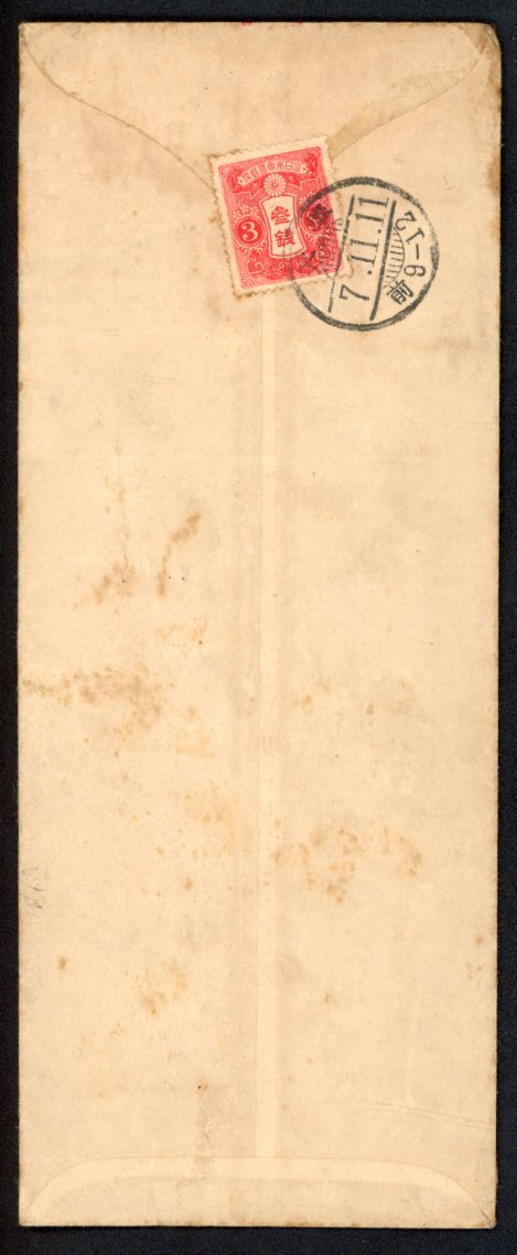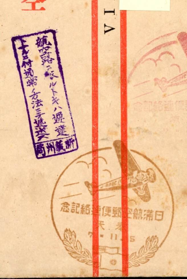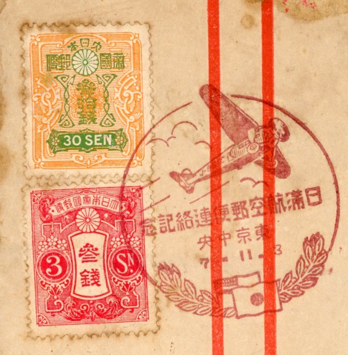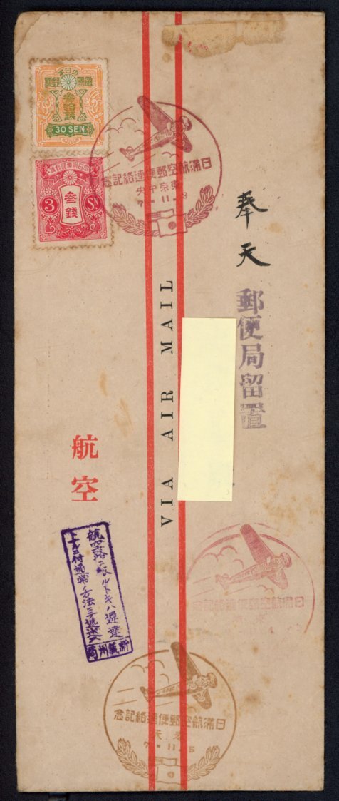 A115 エンタイヤ 新大正毛紙3銭・30銭貼 日満航空郵便連絡記念 特印 東京中央/7.11.3・奉天/7.11.5 エアメール