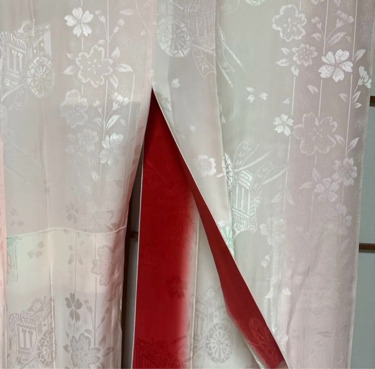 ・長襦袢 薄ピンク色 桜と牛車柄 両袖内外側は真紅振袖に合わせた寸法です。