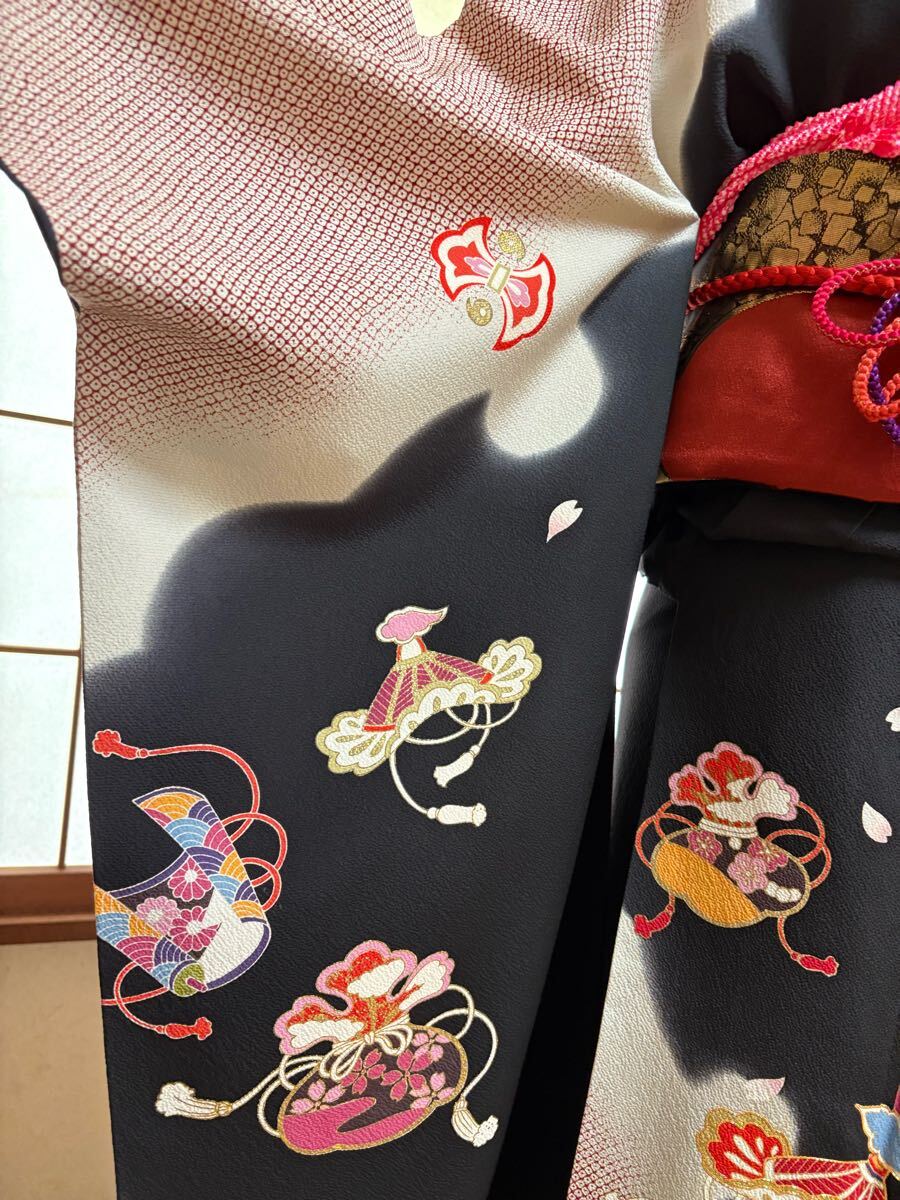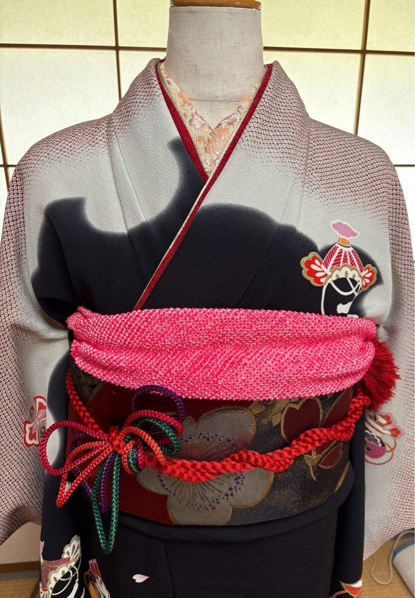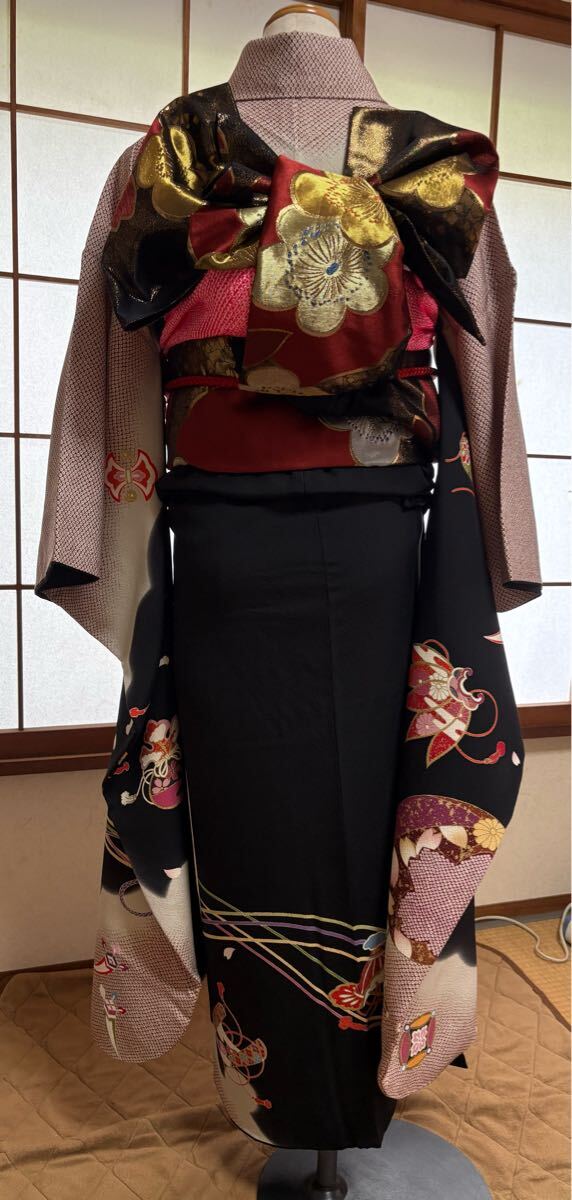 セット内容は、振袖、袋帯、長襦袢、帯揚げ、帯締め、半衿、重ね衿、前掛け(トイレ時使用)以上です。